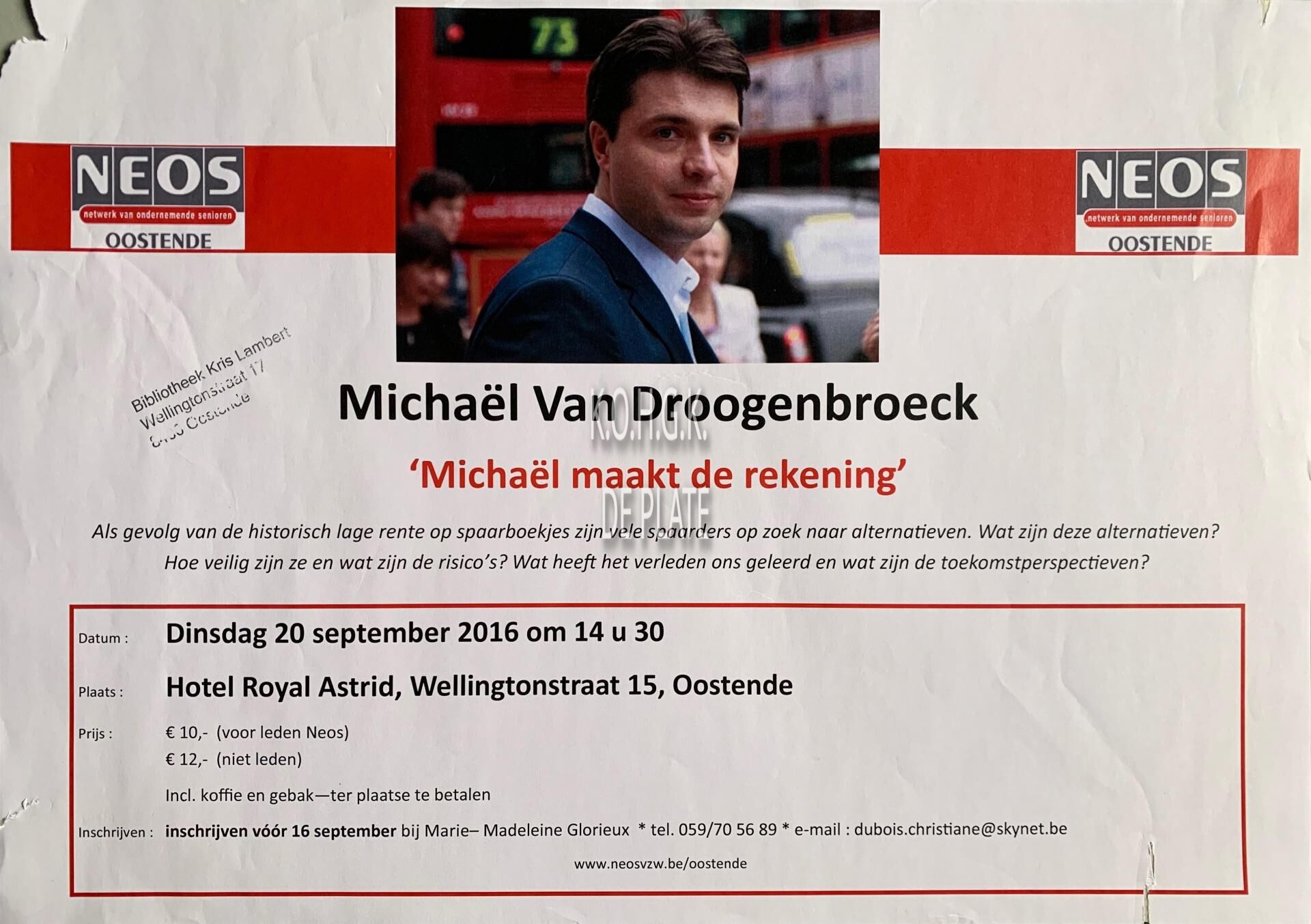 Affiche : NEOS. Michaël Van Droogenbroeck. Michaël maakt de rekening. Hotel Royal Astrid. 20/09/2016