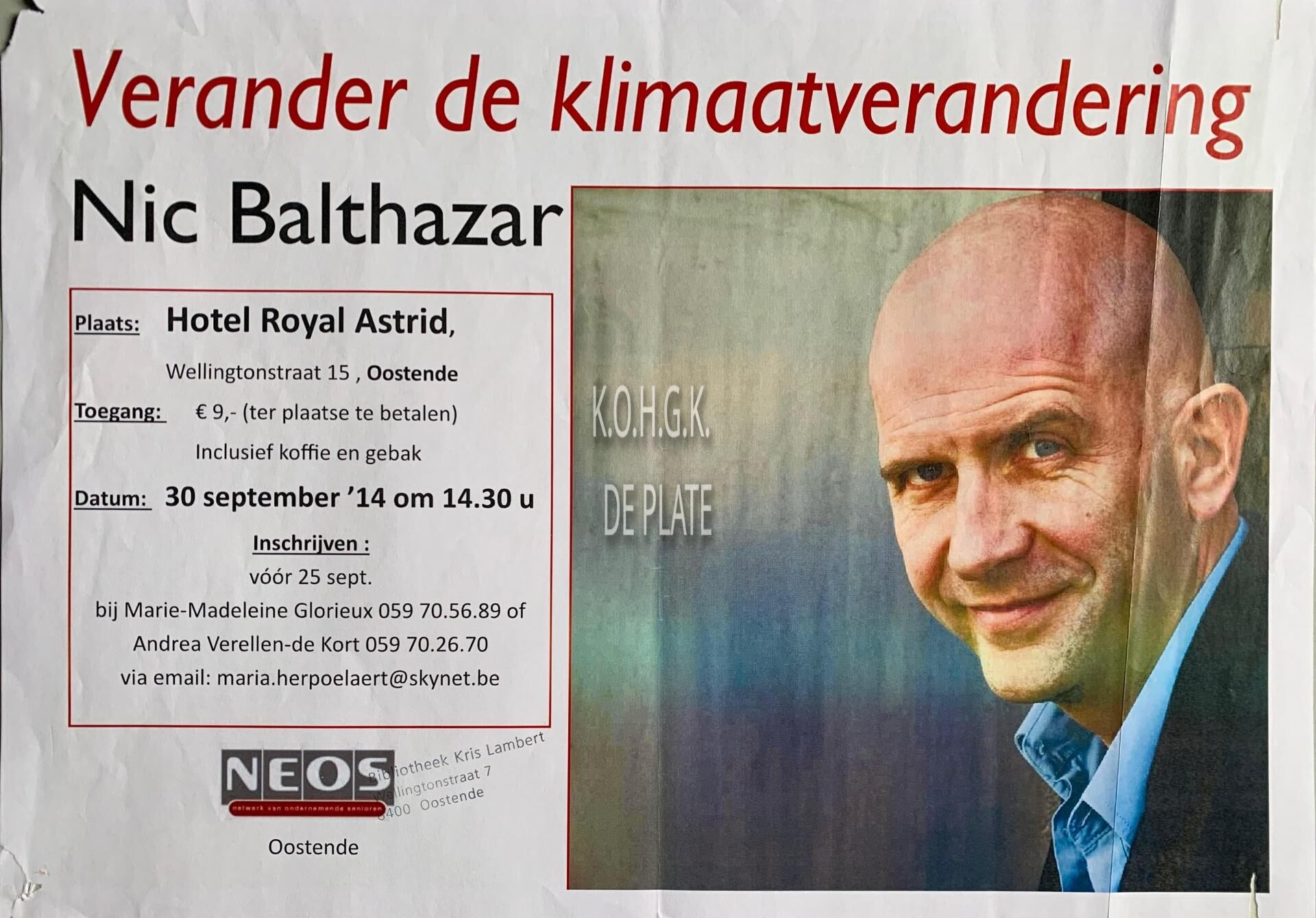 Omschrijving Formaat : 30 x 42 cm. Trefwoorden NEOS (NETWERK VAN ONDERNEMENDE SENIOREN) AFFICHES VOORDRACHTEN KLIMAATVERANDERING HOTEL ROYAL ASTRID BALTHAZAR NIC (FILMREGISSEUR TELEVISIEMAKER) Plaatskenmerk ZOLDER 301 LKA/04/493/54/2014-09 Inventarisnummers 2020/0812 30/ 09/ 2014 Herkomst BIBLIOTHEEK KRIS LAMBERT Collectie Socio- Culturele Verenigingen Neos Print