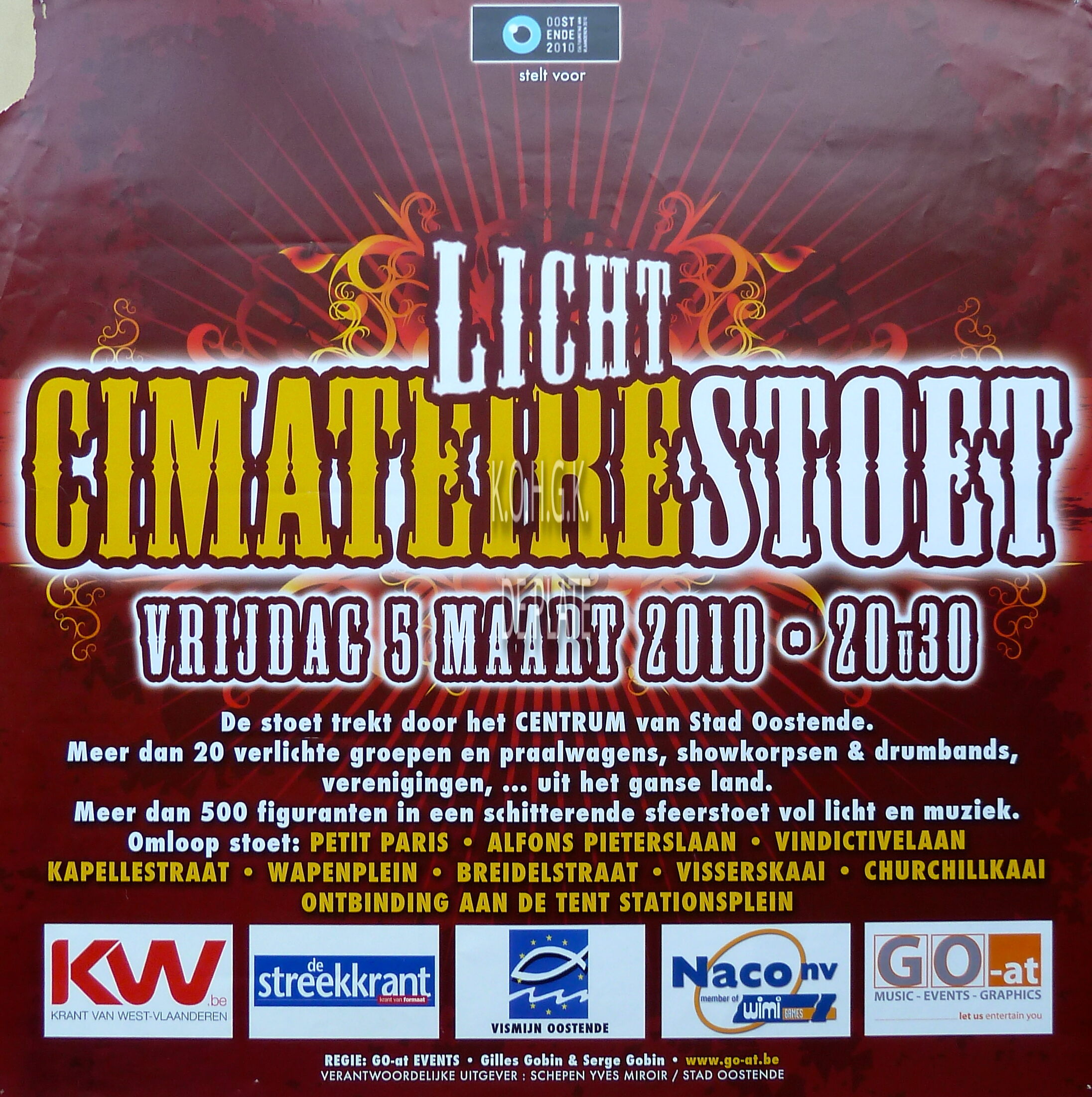Affiche : Oostende 2010. Licht Cimateirestoet. Stadscentrum Oostende. vrijdag 5 maart 2010