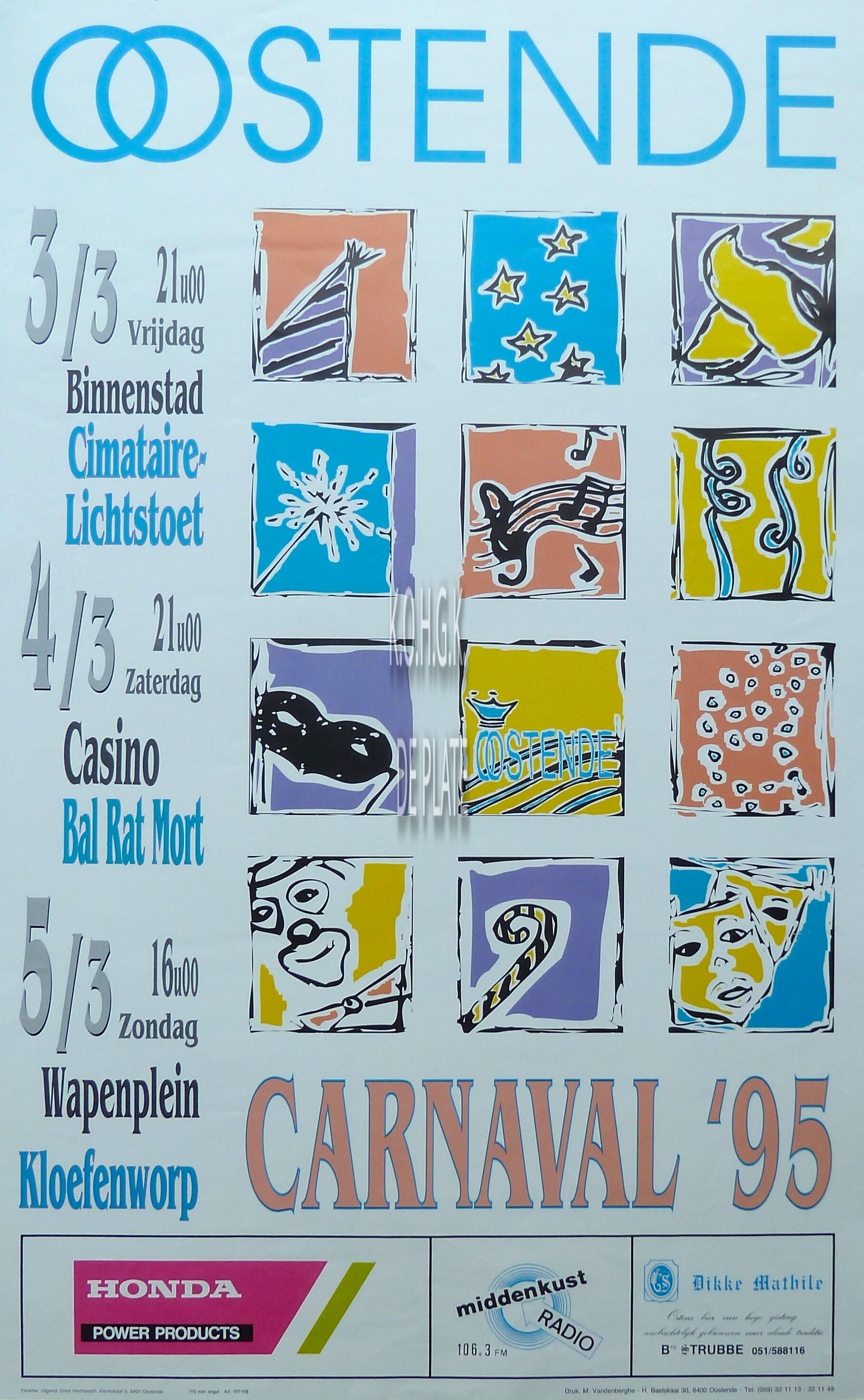 Formaat : 60 x 38 cm.- Binnenstad: (3 maart) cimataire-lichtstoet. Casino (4 maart) : Bal Rat mort. Wapenplein (5 maart): Kloefenworp.Plaatskenmerk