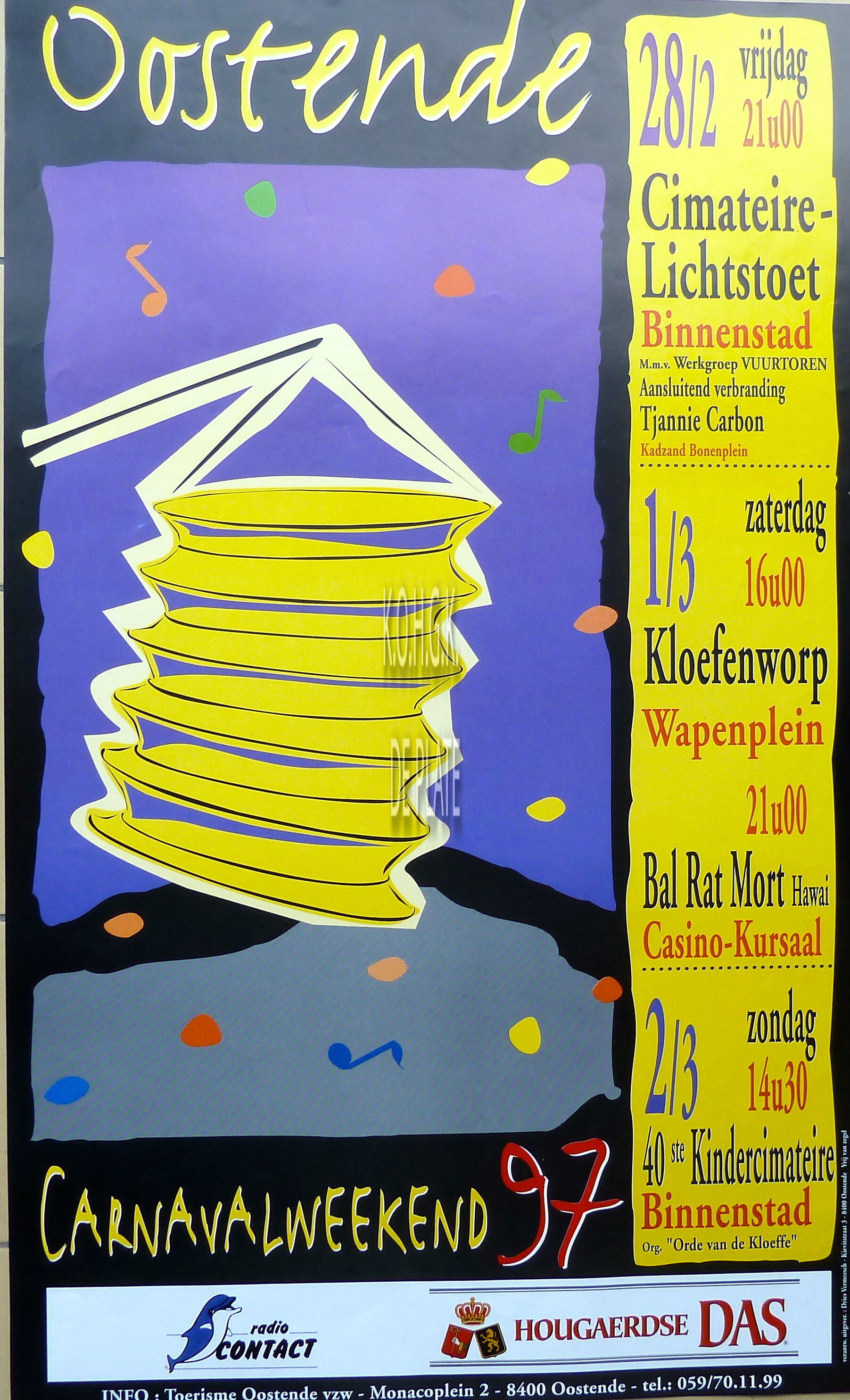 Formaat : 64 x 39 cm. - 28/2 : Cimateirestoet. Binnenstad. m.m.v. Werkgroep Vuurtoren. Aansluitend verbranding Tjannie Carbon, Kadzand Bonenplein ; 1/3 : Kloefenworp. Wapenplein. Bal Rat Mort. Hawai. Casino-Kursaal ; 2/3 : 40ste Kindercimateire. Binnenstad. Org. Orde van de Kloeffe