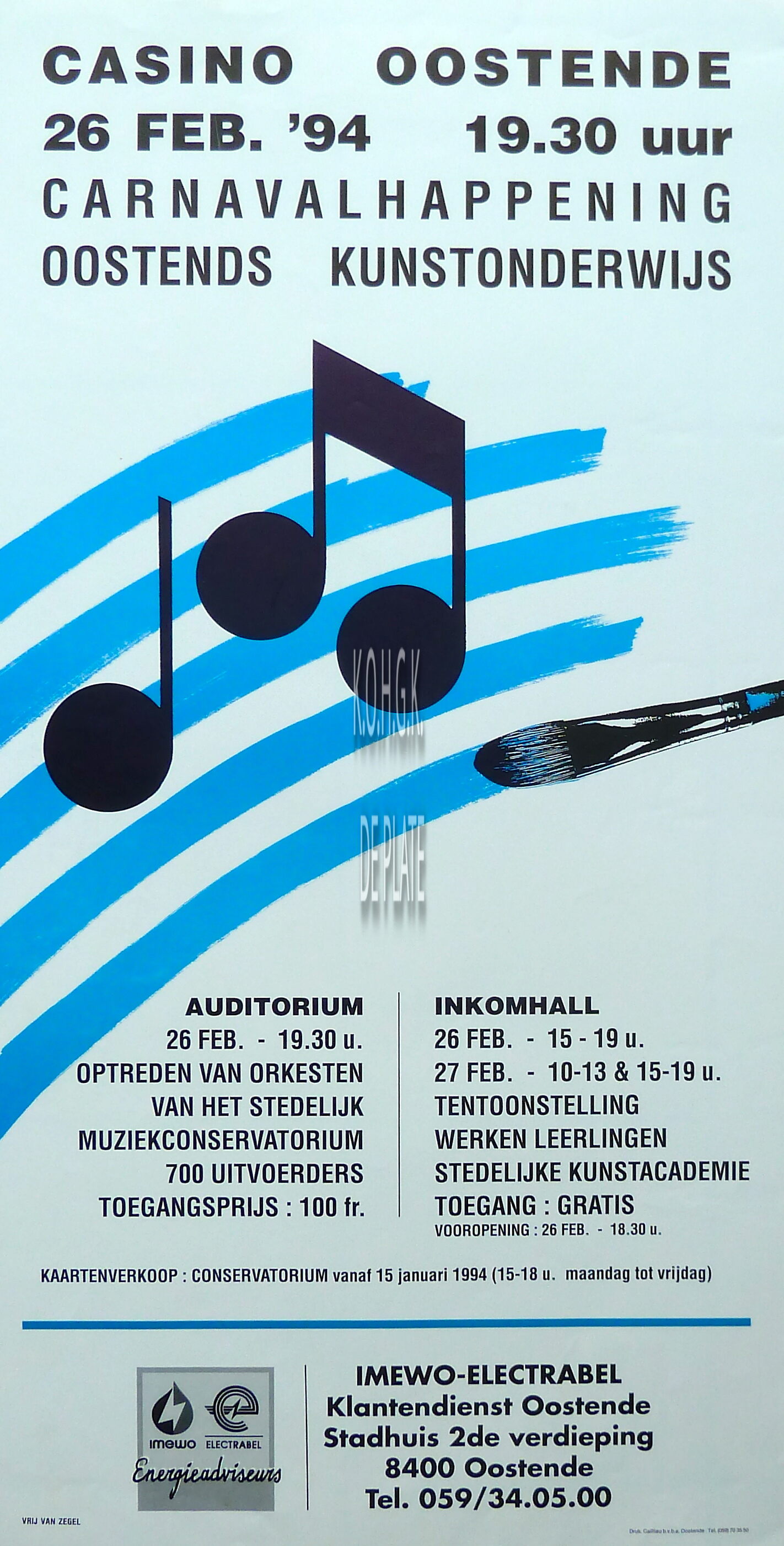 Formaat : 63 x 33 cm. - In het auditorium (26feb.) optreden van orkesten van het stedelijk muziekconservatorium. (700 uitvoerders). In de inkomsthal (26 feb. en 27 feb.) tentoonstelling werken van de leerlingen stedelijke kunstacademie.Plaatskenmerk