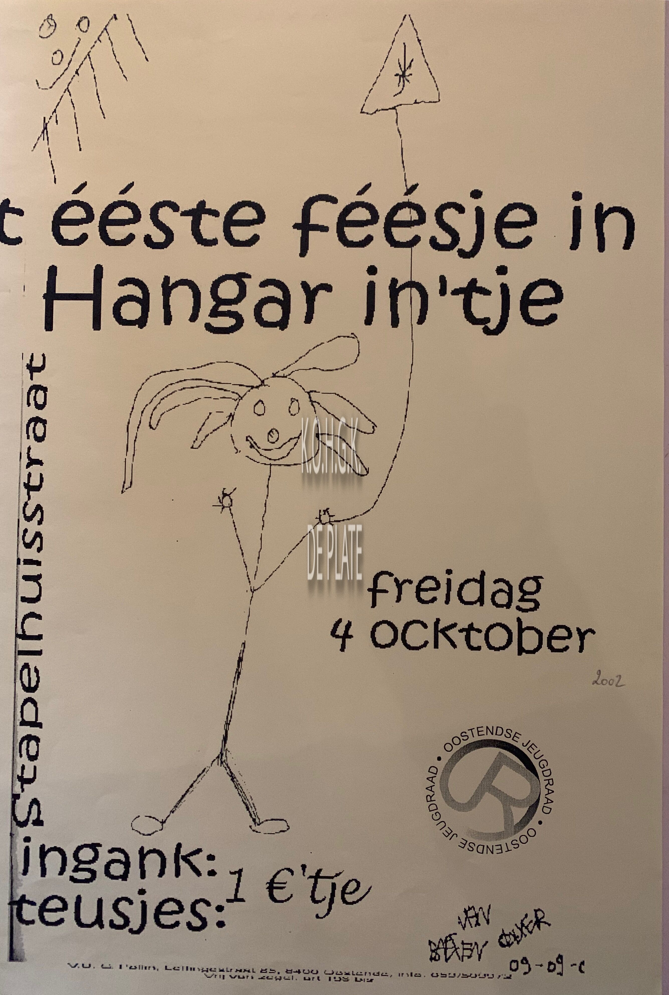 Affiche : Oostendse Jeugdraad. 't éérste féésje in Hangar in'tje. Stapelhuisstraat. 04/10/[2002]