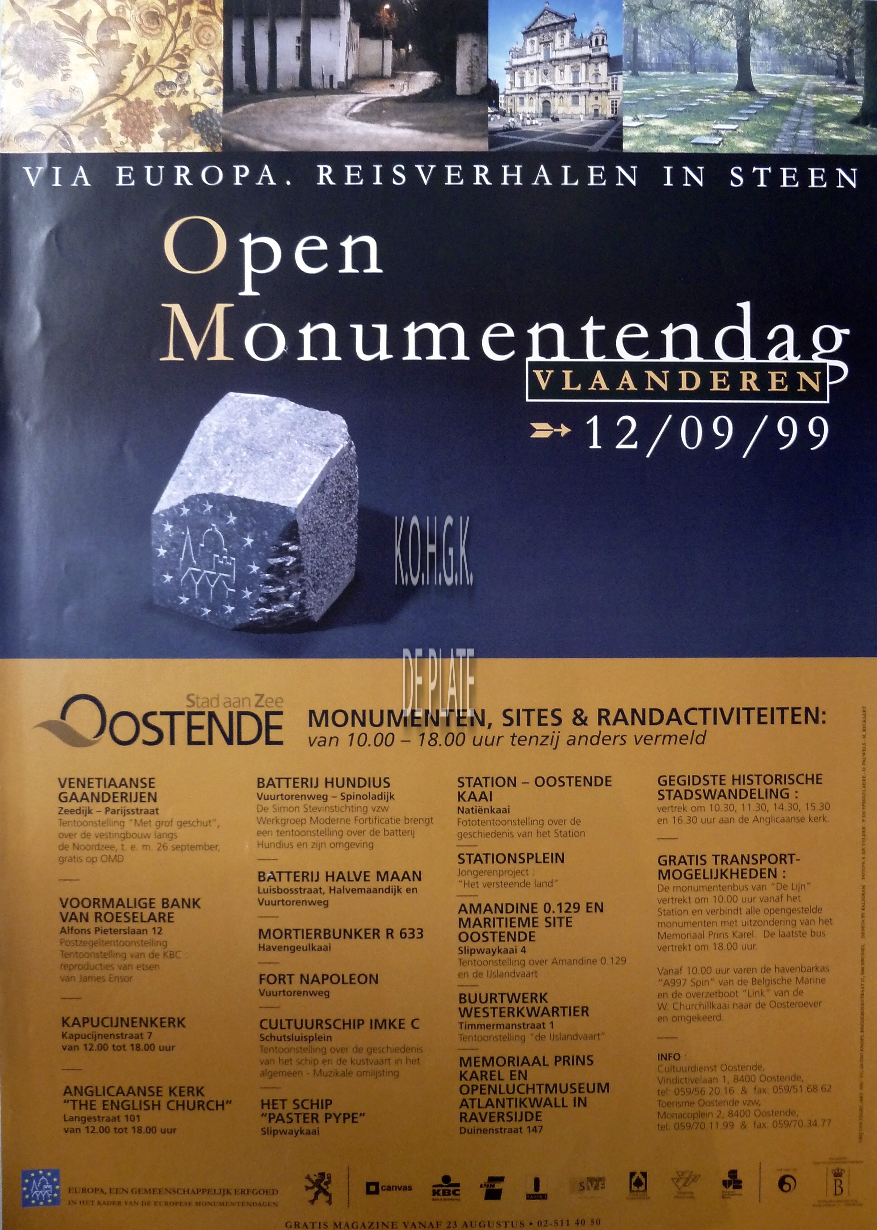 Affiche : Open Monumentendag Vlaanderen. Via Europa, Reisverhalen in steen. [Programma Oostende]. 12/09/1999