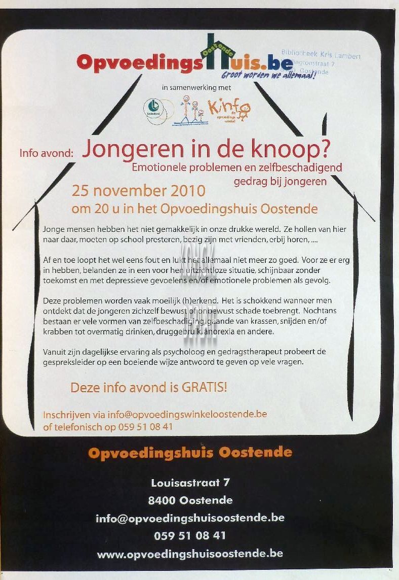 Affiche : Opvoedingshuis Oostende. Info avond: Jongeren in de knoop?, Emotionele problemen en zelfbeschadigend gedrag bij jongeren. Opvoedingshuis Oostende. 25/11/2010