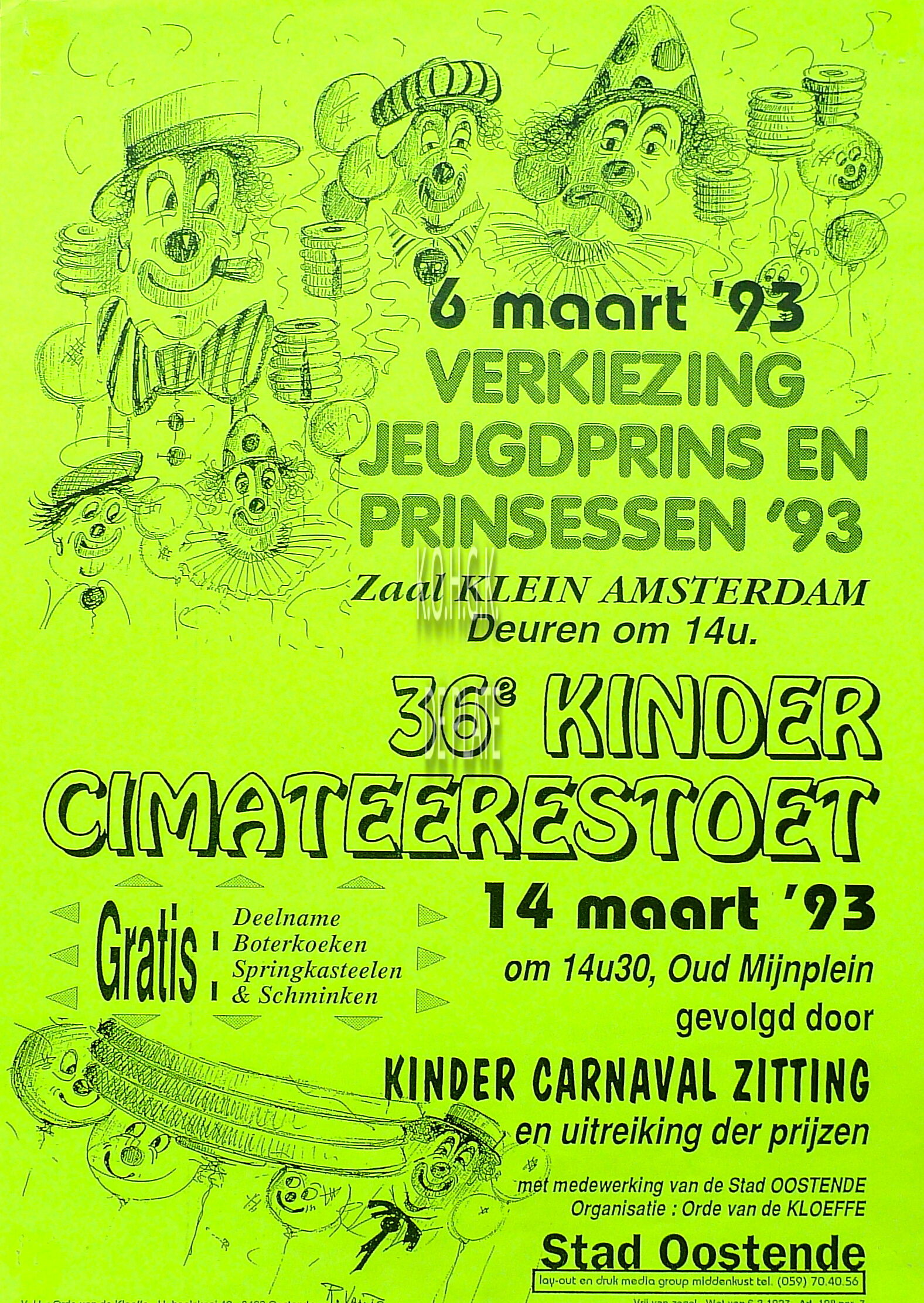 Formaat: 42 x 30 cm. - Met medewerking van Stad Oostende. 6 maart : Zaal Klein Amsterdam : Verkiezing jeugdprins en -prinsessen '93. 14 maart : Oud Mijnplein : 36e Kindercimaterestoet gevolgd door kinder carnaval zitting en uitreiking der prijzen.