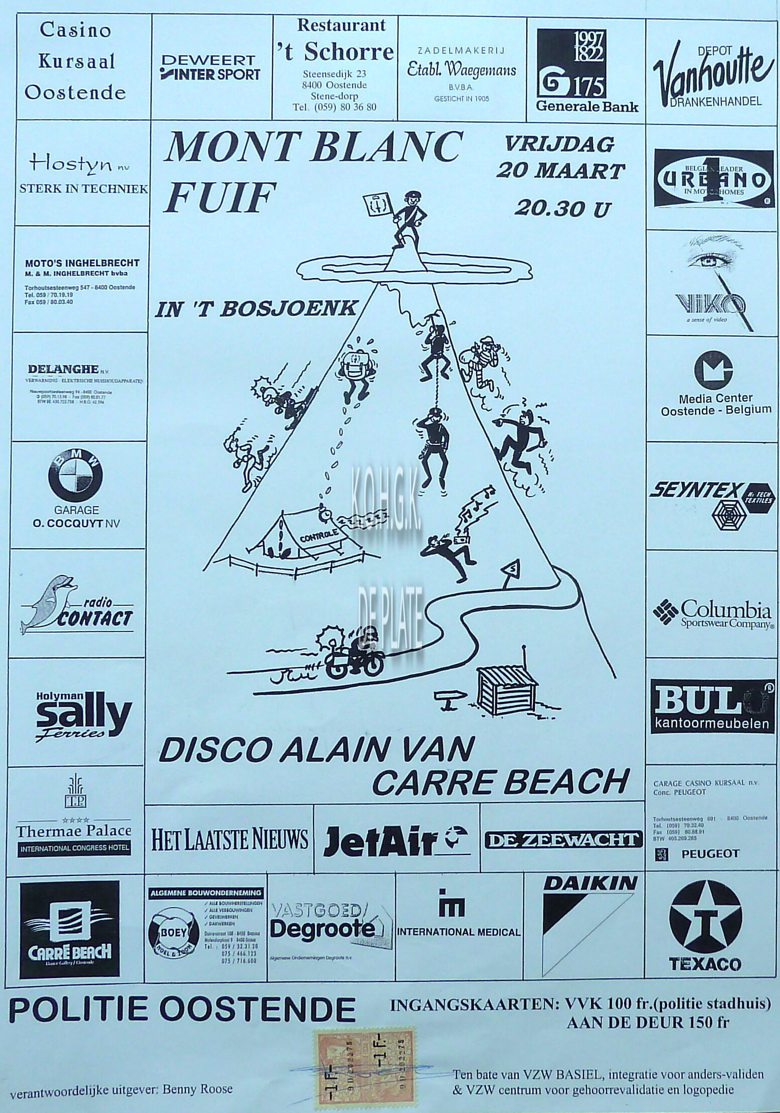 Affiche : Politie Oostende. Mont Blanc Fuif. Zaal 't Bosjoenk. 20/03/.... (?)