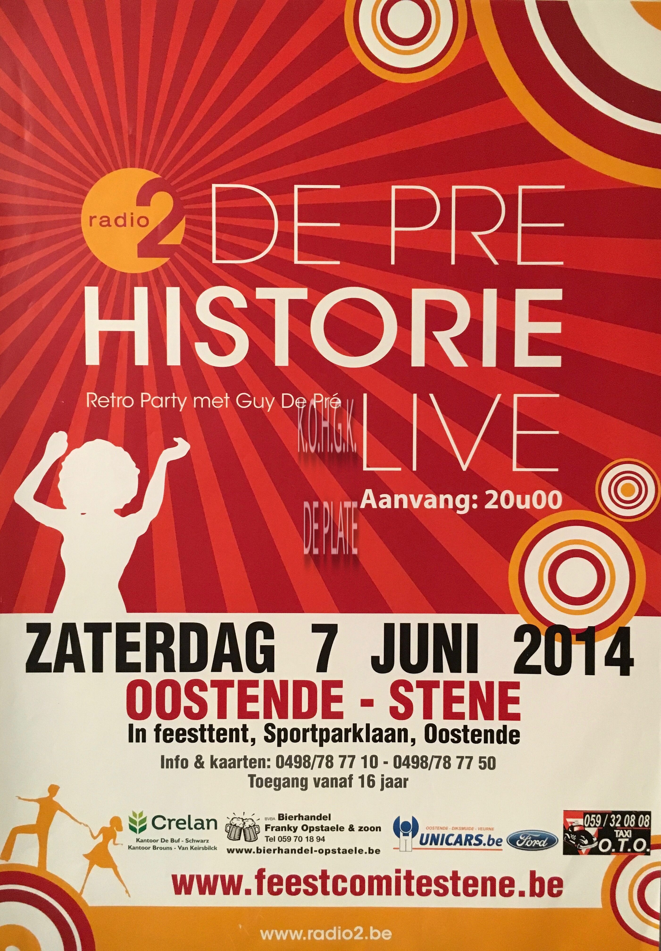 Affiche : Radio 2. De pre historie, retro party met Guy De Pré. In feesttent, Sportparklaan. Op 7 juni 2014