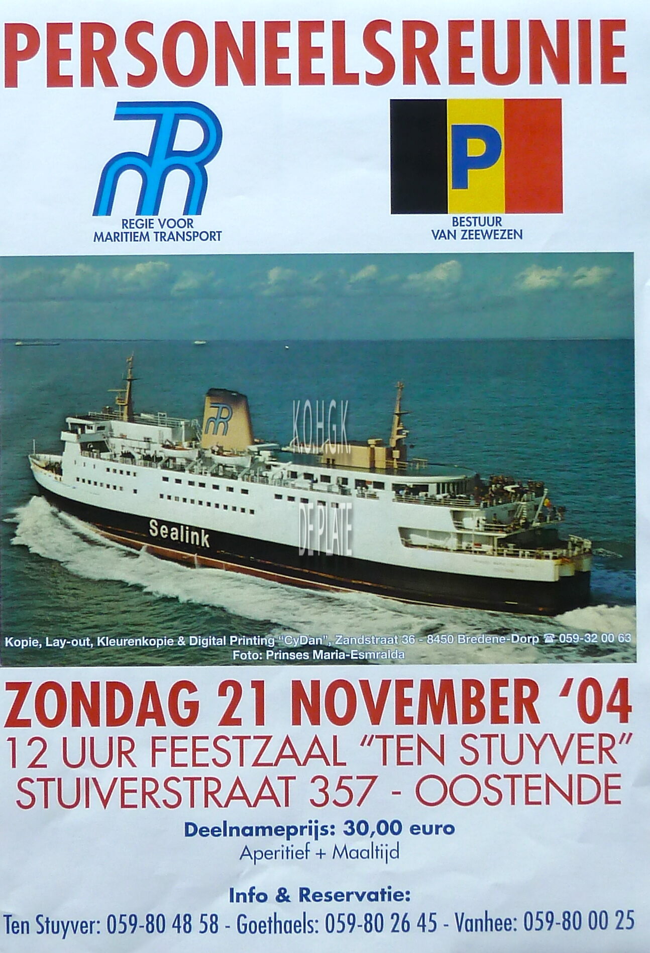 Affiche : Regie voor Maritiem Transport. Bestuur van Zeewezen. Personeelsreunie. Feestzaal "Ten Stuyver". 21/11/2004
