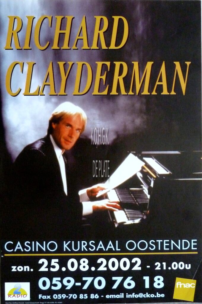 Omschrijving Formaat : 60 x 40 cm. Trefwoorden AFFICHES CASINO-KURSAAL ; CONCERTEN MUZIEK ; CONCERTEN CLAYDERMAN RICHARD (PIANIST) Plaatskenmerk ZOLDER 301 LKA/11/780/11/2002-08/MAP 5 Inventarisnummers 2003/0444 25/ 08/ 2002 Vervaardiger Marc Schelfhout Herkomst BIBLIOTHEEK KRIS LAMBERT Collectie Muziek Casino-Kursaal Print