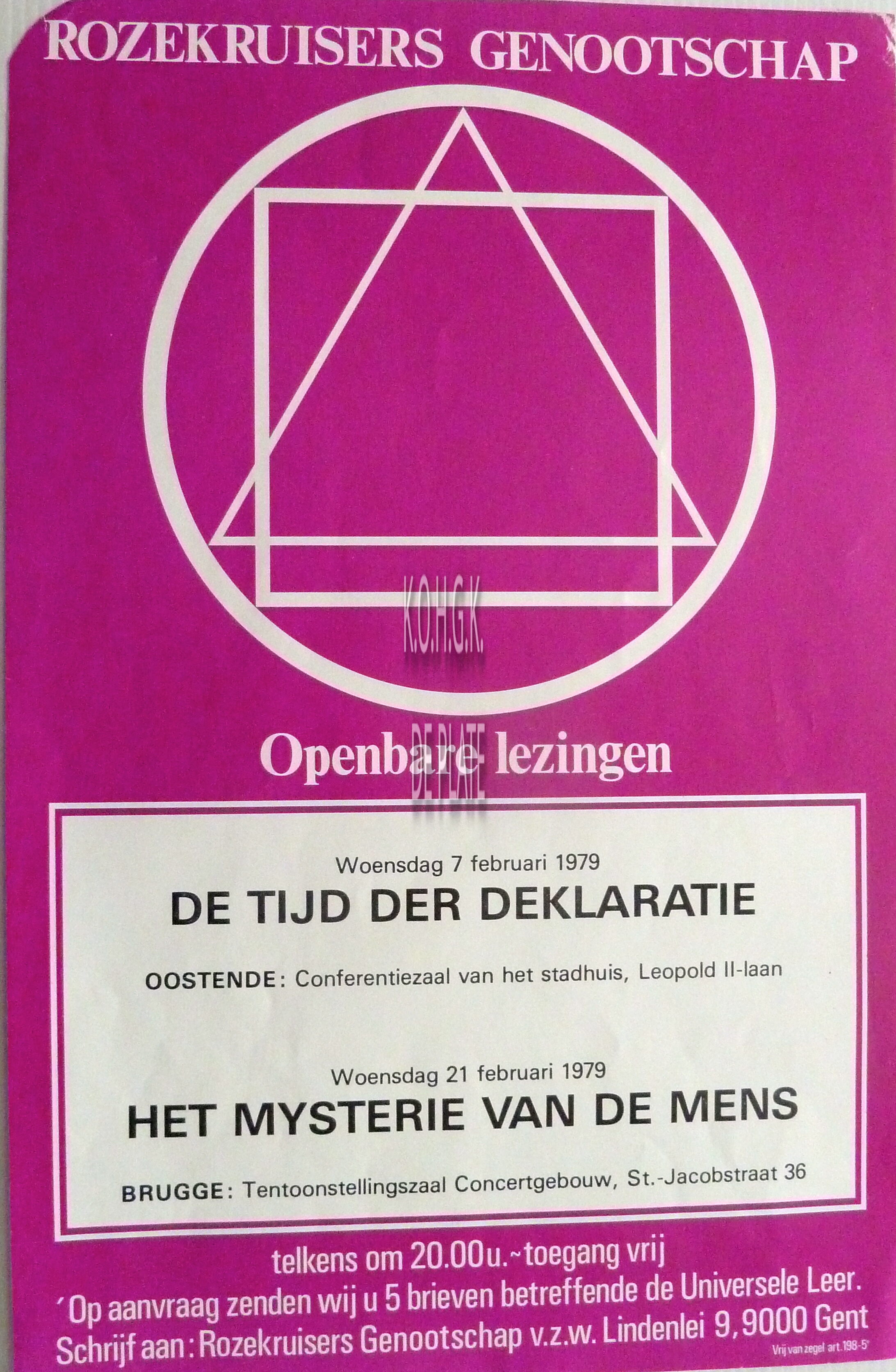 Affiche : Rozenkruisers Genootschap. De tijd der declaratie. Openbare lezing. Stadhuis Oostende. 07/02/1979