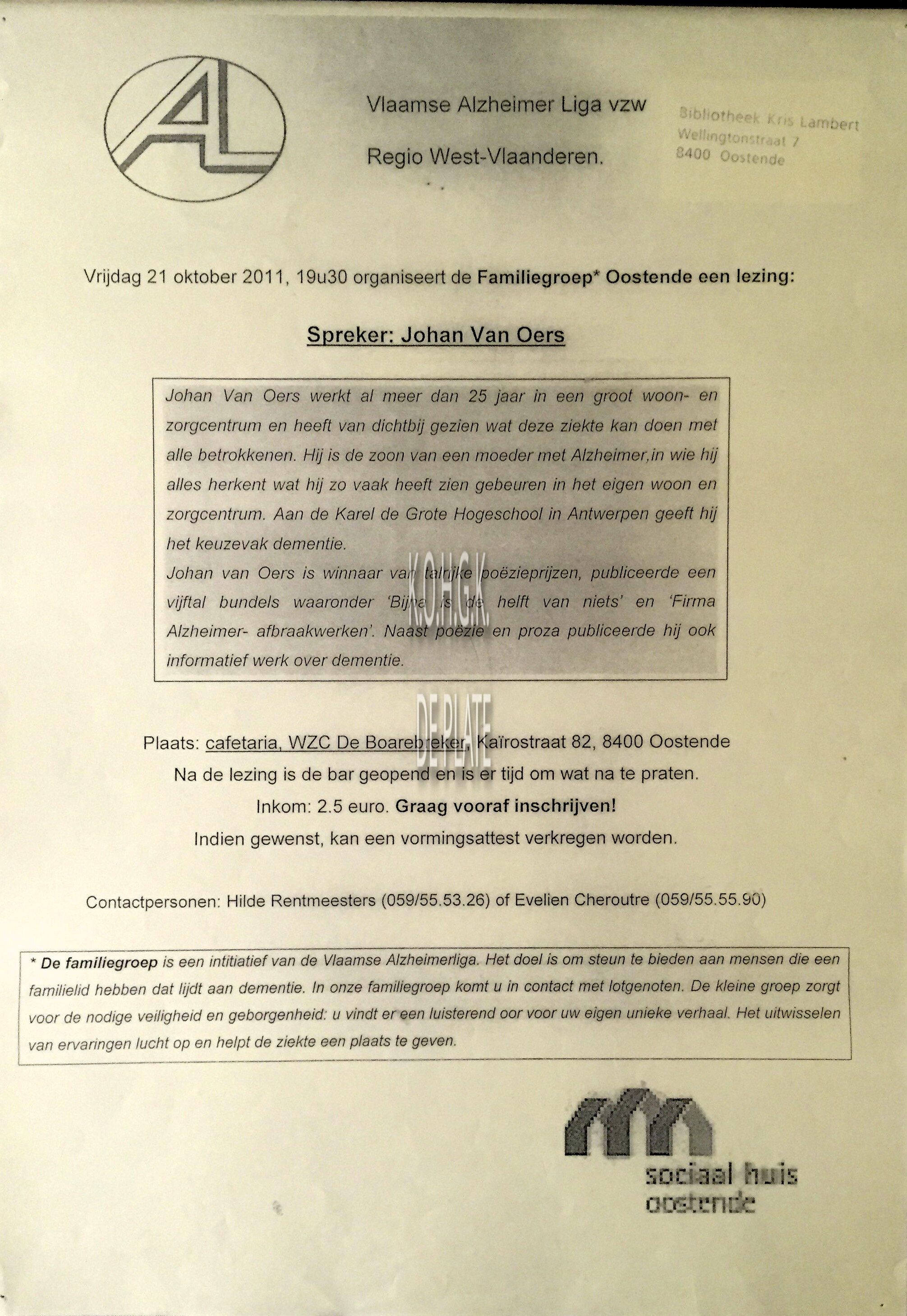 Omschrijving Formaat: 42 x 30 cm Trefwoorden AFFICHES SOCIAAL HUIS OOSTENDE (OCMW) SOCIALE VOORZIENINGEN ; DE BOAREBREKER (WOON- EN ZORGCENTRUM) VOORDRACHTEN ZIEKTEN Plaatskenmerk AFFICHES ZOLDER 2012/1056 Inventarisnummers 2012/1056 21/ 10/ 2011 Herkomst BIBLIOTHEEK KRIS LAMBERT Print