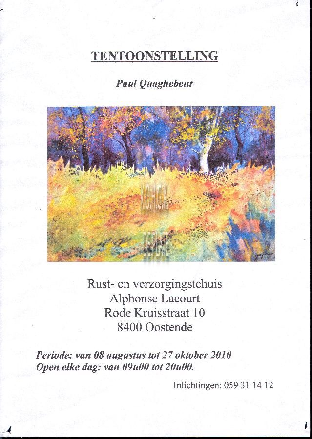 Omschrijving Formaat : 30 x 21 cm. Rust- en verzorgingstehuis Alphonse Lacourt. Rode kruisstraat 10, 8400 Oostende Trefwoorden AFFICHES KUNSTTENTOONSTELLINGEN SOCIALE VOORZIENINGEN ; ALFONS LACOURT (WOON- EN ZORGCENTRUM) QUAGHEBEUR PAUL (KUNSTSCHILDER) Plaatskenmerk ZOLDER 301 LKA/08/700.4/97/2010 Inventarisnummers 2011/1014 2010 Herkomst BIBLIOTHEEK KRIS LAMBERT Collectie Tentoonstellingen Woon- en Zorgcentrum A. Lacourt Print