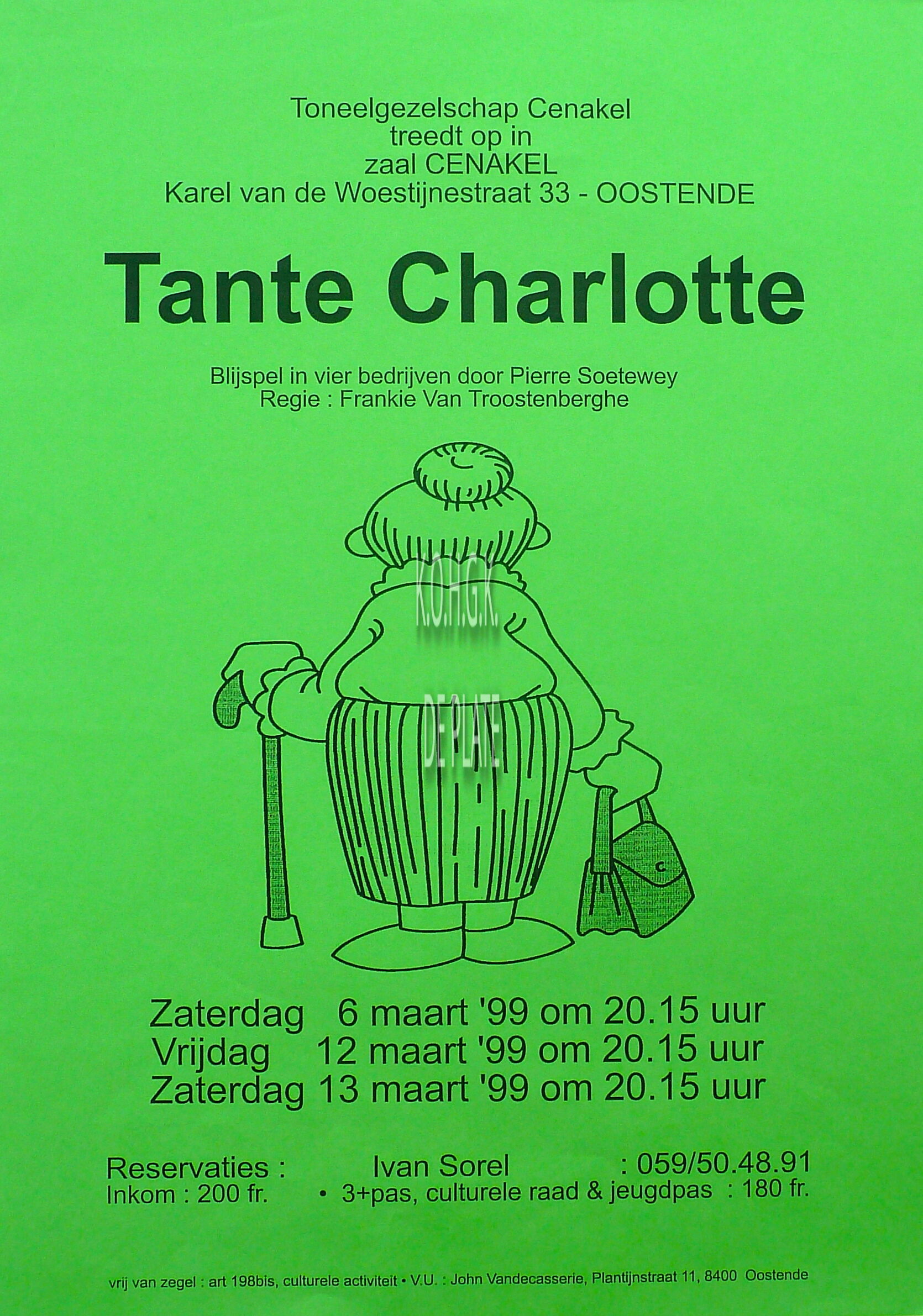 Omschrijving Formaat : 42 x 30 cm. - Blijspel in vier bedrijven door Pierre Soetewey. Regie : Frankie Van Troostenberghe Trefwoorden AFFICHES CENAKEL (TONEELGEZELSCHAP) TANTE CHARLOTTE (TONEELSTUK) TONEELSTUKKEN SOETEWEY PIERRE (AUTEUR) VAN TROOSTENBERGHE FRANKIE (REGISSEUR) ZAAL CENAKEL (KAREL VAN DE WOESTIJNESTRAAT) Plaatskenmerk ZOLDER 301 LKA/15/792/57/1999-03 Inventarisnummers 2017/2768 03/ 1999 Uitgever John Vandecasserie Herkomst AANKOOP Collectie Toneel Toneelgezelschap Cenakel Print