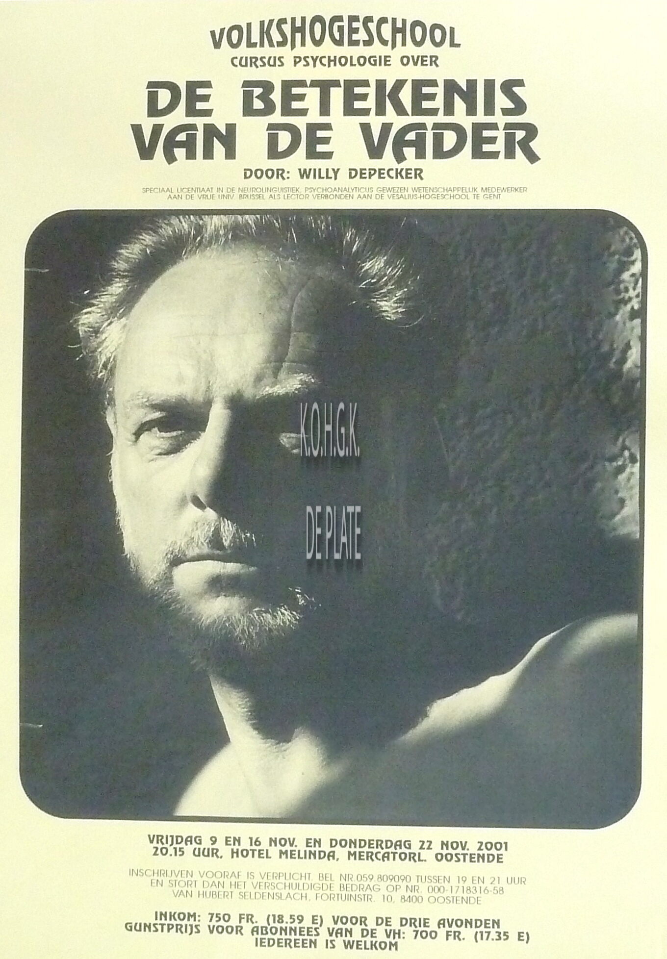 Affiche : Volkshogeschool. De betekenis van de vader : cursus psychologie. Hotel Melinda. 09,16 en 27/11/2001