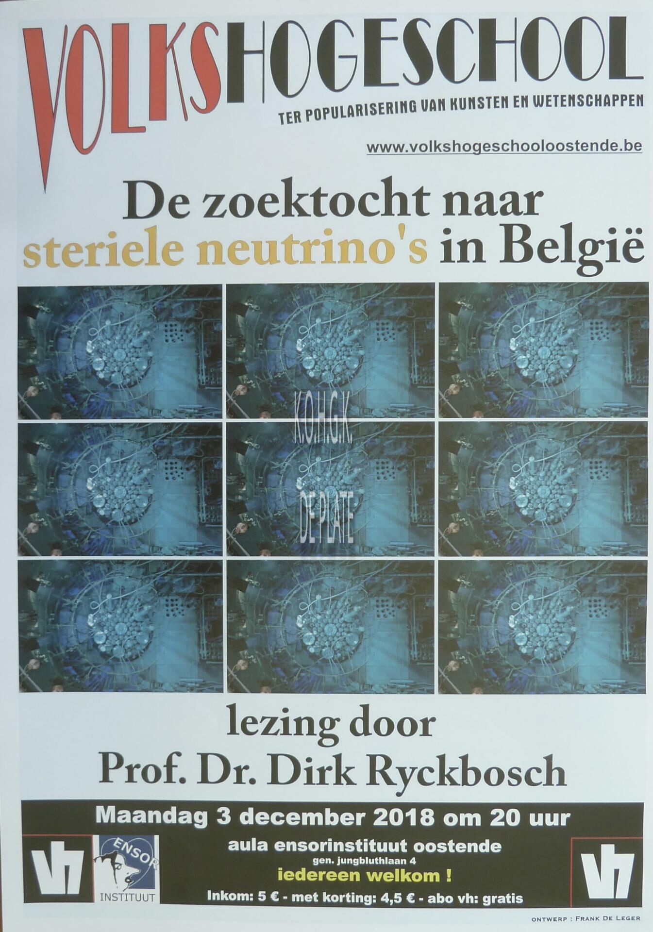 Affiche : Volkshogeschool. De zoektocht naar steriele neutrino's in België : lezing. Aula Ensorinstituut. 03/12/2018