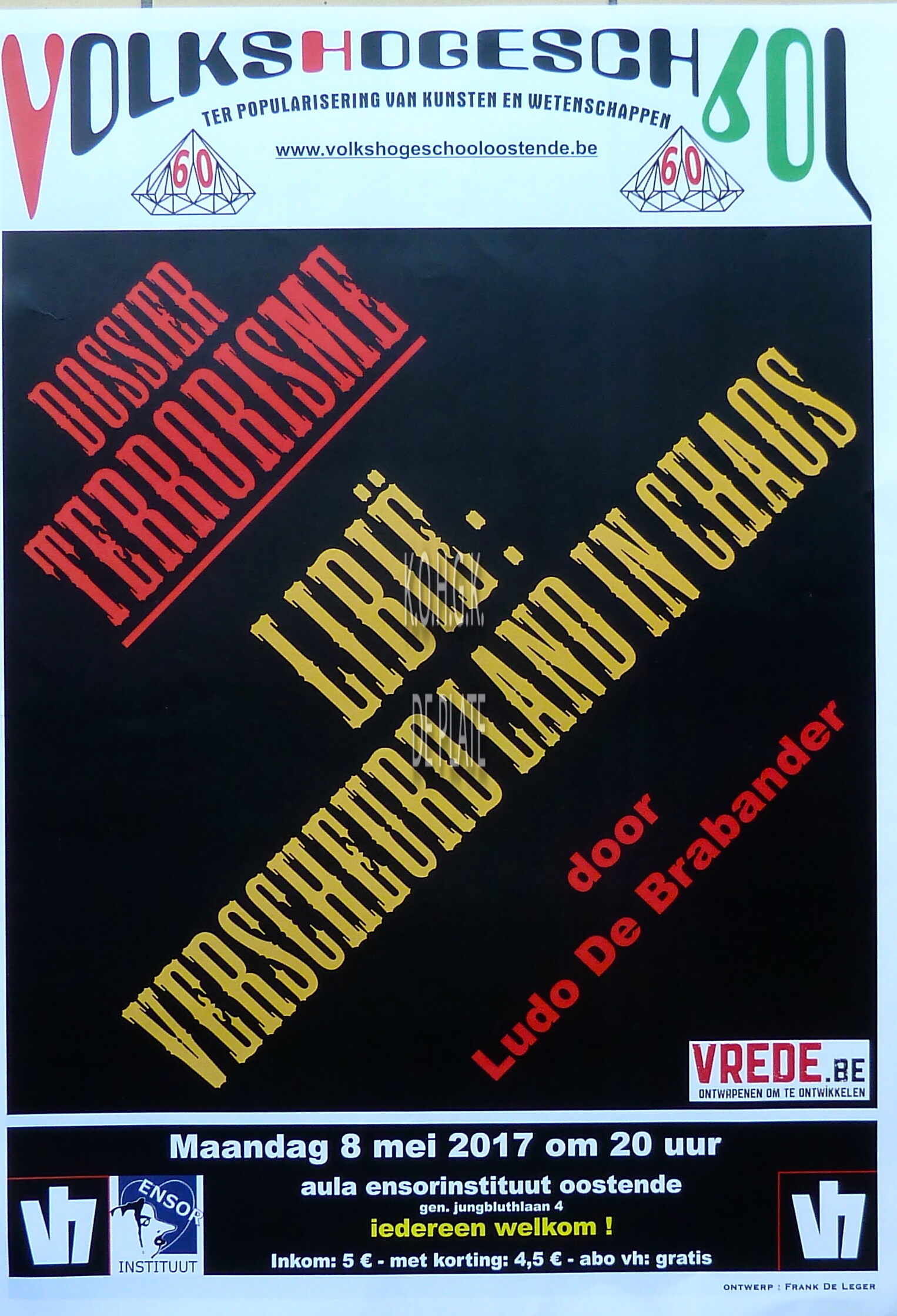 Affiche : Volkshogeschool. Dossier terrorisme : Libië : verscheurd land in chaos. Aula Ensorinstituut. 08/05/2017