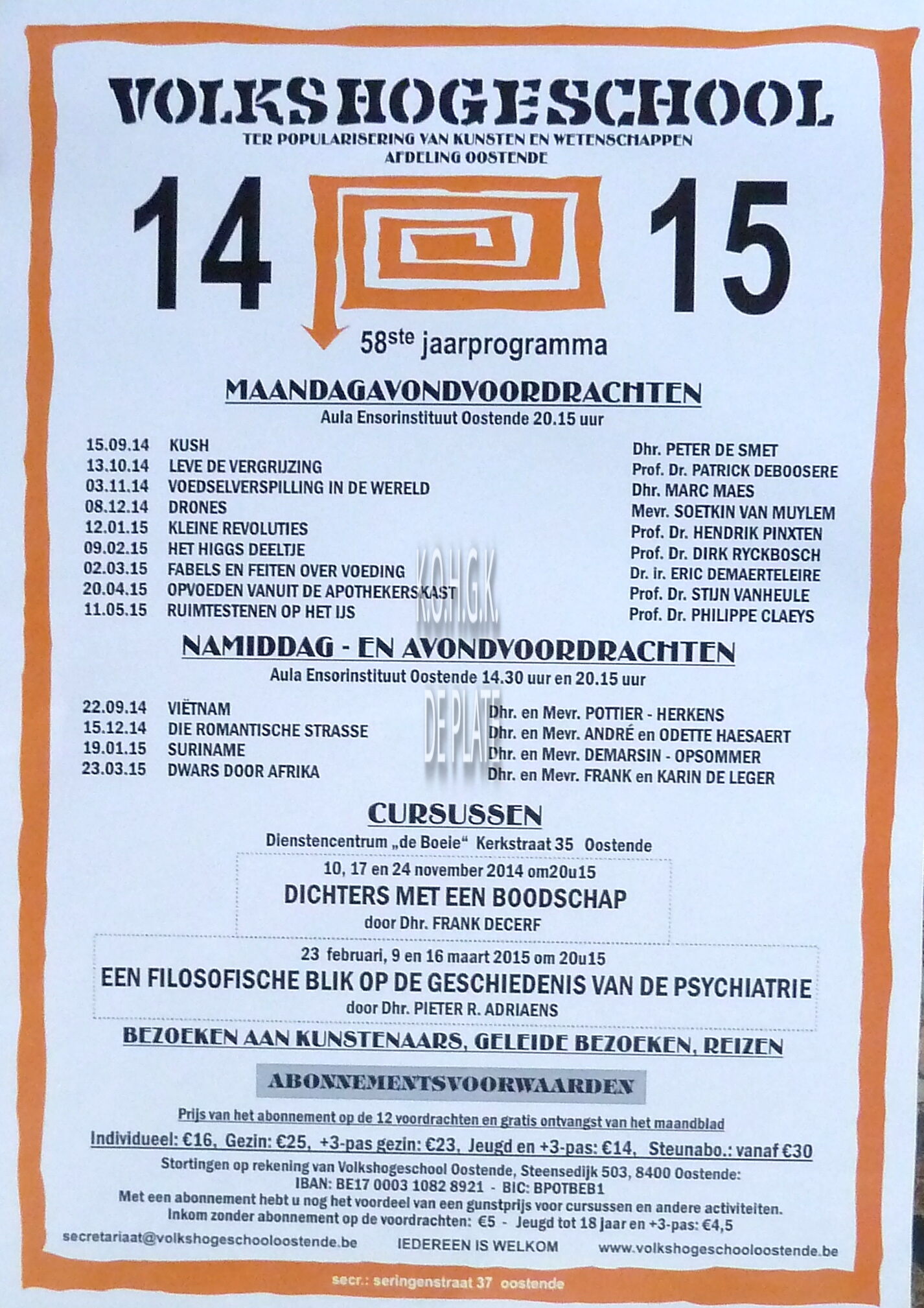 Formaat : 42 x 30 cm. - 58ste jaarprogramma. Maandagavondvoordrachten. Aula Ensorinstituut Oostende 20.15 uur. - 2014 : 15/09 : Kush door Peter De Smet ; 13/10 : Leve de vergrijzing door Patrick Deboosere ; 03/11 : Voedselverspilling in de wereld door Marc Maes ; 08/12 : Drones door Soetkin Van Muylem ; 2015 : 12/01 : Kleine revoluties door Hendrik Pinxten ; 09/02 : Het Higgs deeltje door Dirk Ryckbosch ; 02/03 : Fabels en feiten over voeding door Eric Demaerteleire ; 20/04 : Opvoeden vanuit de apothekerskast door Stijn Vanheule ; 11/05 : Ruimtestenen op het ijs door Philippe Claeys