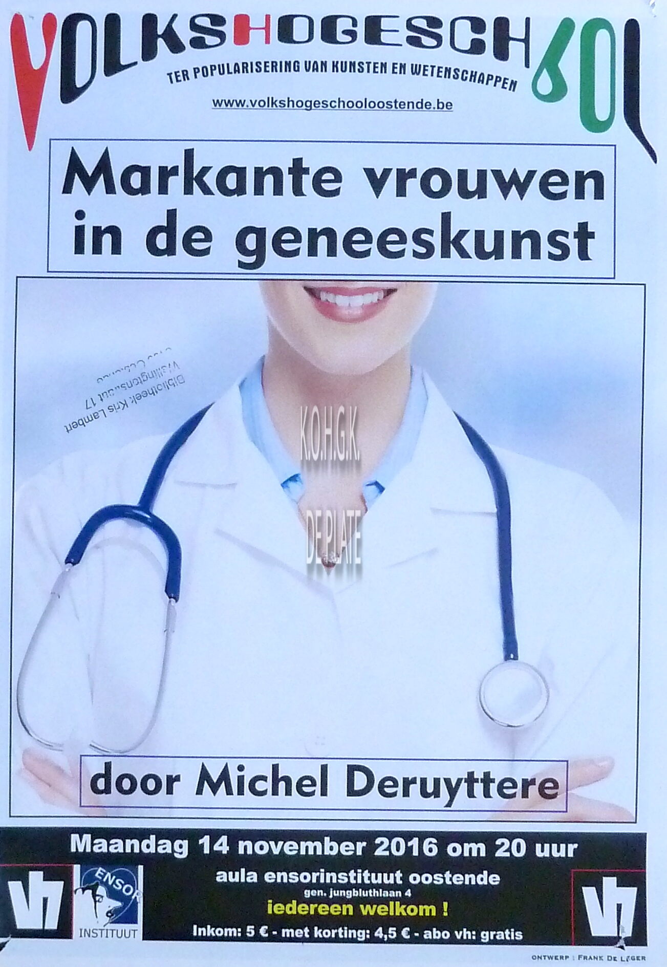 Affiche : Volkshogeschool. Markante vrouwen in de geneeskunde. Aula Ensorinstituut. 14/11/2016