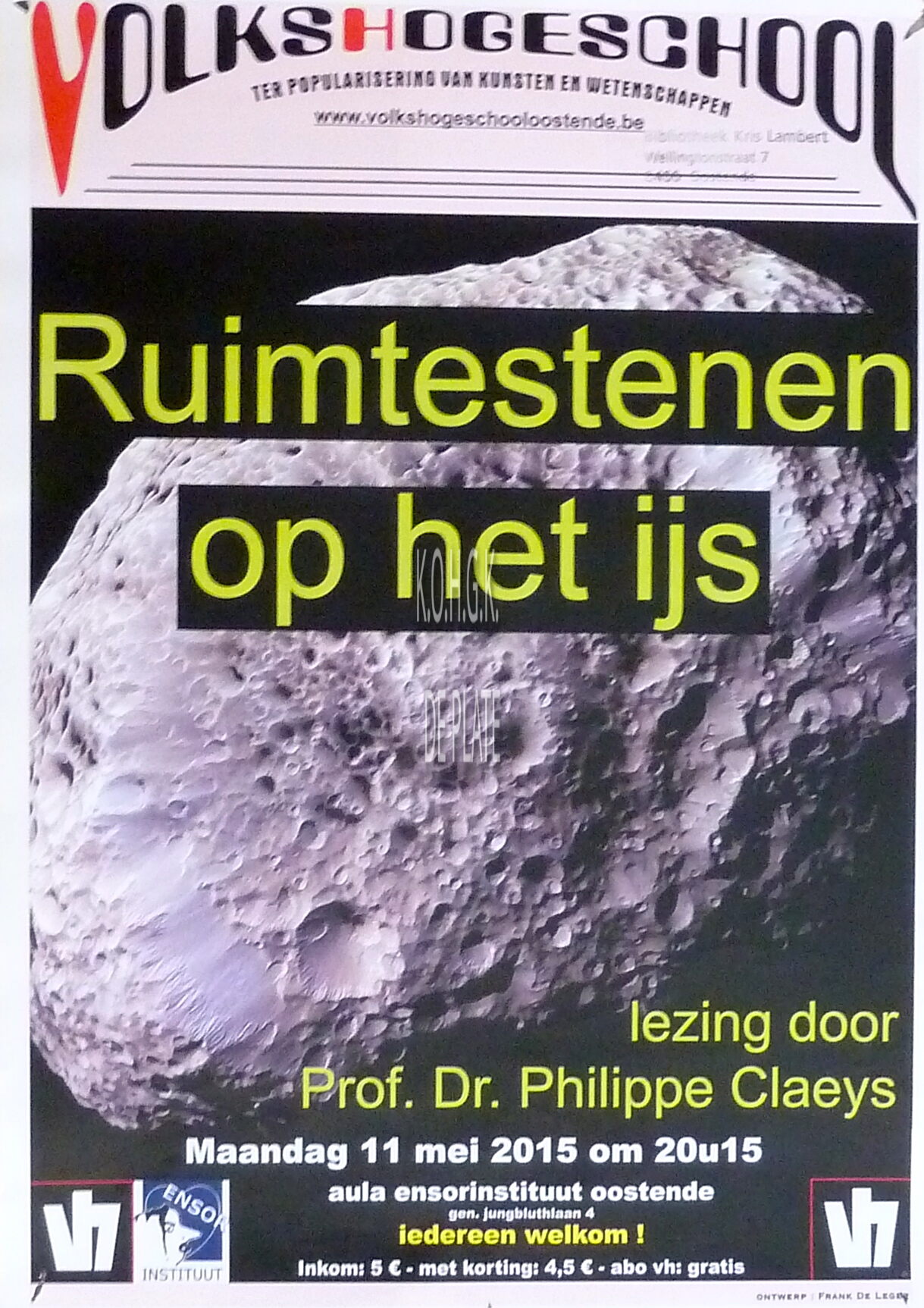 Affiche : Volkshogeschool. Ruimtestenen op het ijs : lezing. Aula Ensorinstituut. 11/05/2015