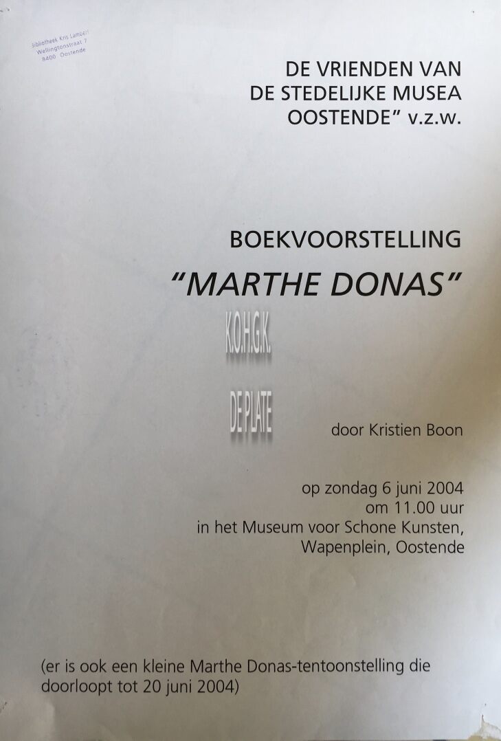 Affiche : V.Z.W. De vrienden van de stedelijke musea Oostende. Boekvoorstelling: Marthe Donas. Museum voor Schone Kunsten. Op 6 juni 2004