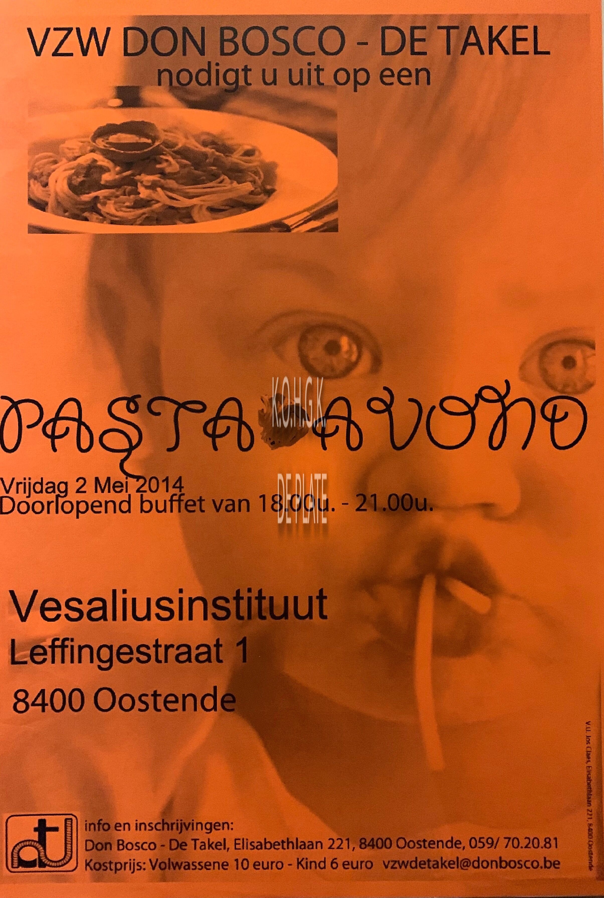 Affiche : vzw Don Bosco - De Takel. Pasta avond. Vesaliusinstituut. 02/05/2014
