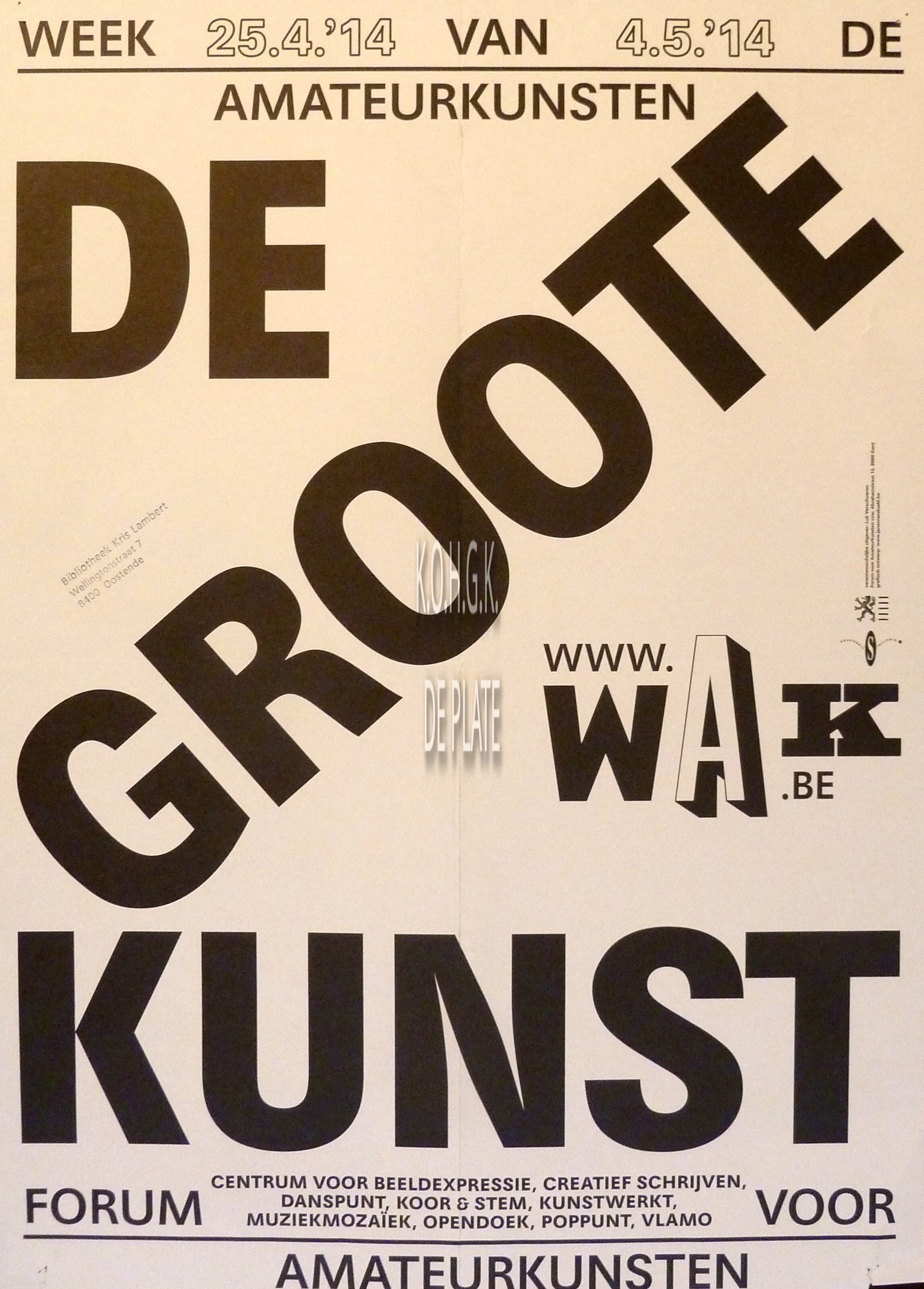 Omschrijving Formaat : 60 x 42 cm. Trefwoorden AFFICHES WAK (WEEK VAN DE AMATEURKUNSTEN) KUNST ; ALGEMEEN Plaatskenmerk ZOLDER 301 LKA/18/700/01/2014 Inventarisnummers 2019/1024 2014 Herkomst BIBLIOTHEEK KRIS LAMBERT Collectie Kunst Algemeen Print