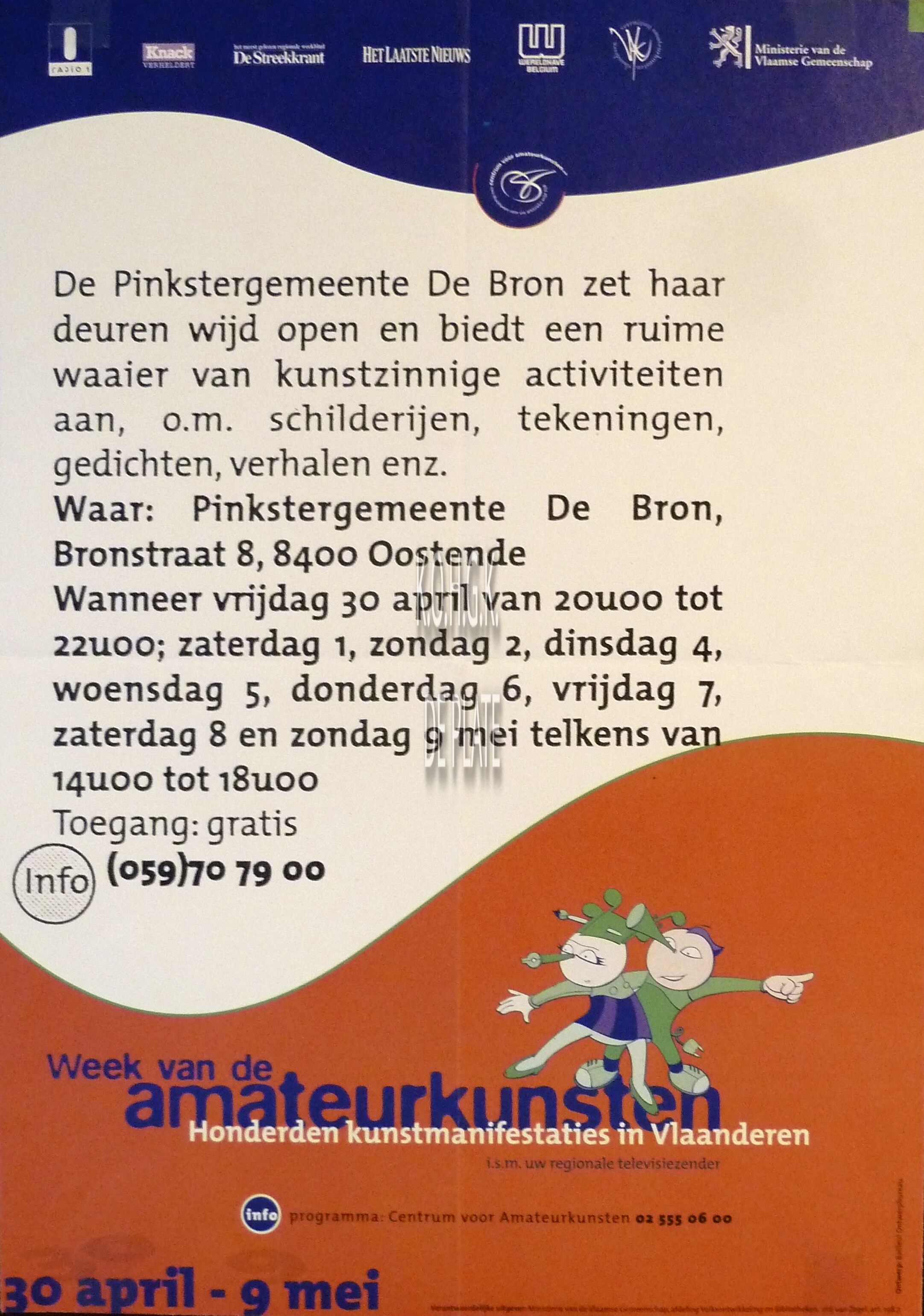 Omschrijving Formaat : 42 x 30 cm. - Pinkstergemeente "De Bron", Bronstraat 8, 8400 Oostende Trefwoorden AFFICHES PINKSTERGEMEENTE DE BRON WAK (WEEK VAN DE AMATEURKUNSTEN) Plaatskenmerk ZOLDER 301 LKA/18/700/01/0001 Inventarisnummers 2019/1017 Uitgever Ministerie van de Vlaamse Gemeenschap Herkomst D. Desnerck Collectie Kunst Algemeen Print