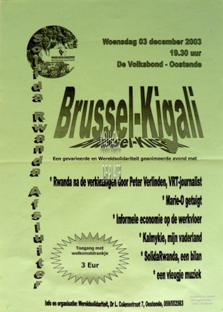 Formaat : 42 x 30 cm. Een gavarieerde en Wereldsolidariteit geanimeerde avond met Rwanda na de verkiezingen door Peter Verlinden, VRT-journalist. Marie-O getuigt. Informele economie op de werkvloer. Kalmykie, mijn vaderland. SolidaRwanda, een bilan. Een vleugje muziek. Wereldsolidariteit. Dr L Colensstraat 7, Oostende