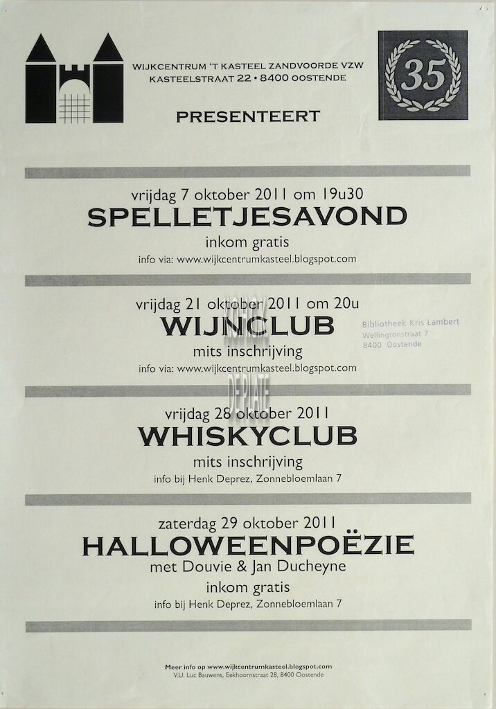 Affiche : Wijkcentrum 't Kasteel Zandvoorde. Spelletjesavond, Wijnclub, Whiskyclub, Halloweenpoëzie. Zandvoorde. 2,28 en 29 oktober 2011.