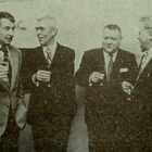 2 foto's : (1) Het publiek tijdens de openingstoespraak van Walter Debrock en (2) van links naar rechts, Marcel Friedrichs, Maurice Boel, Walter Debrock en J. Guillemin tijdens de vernisage