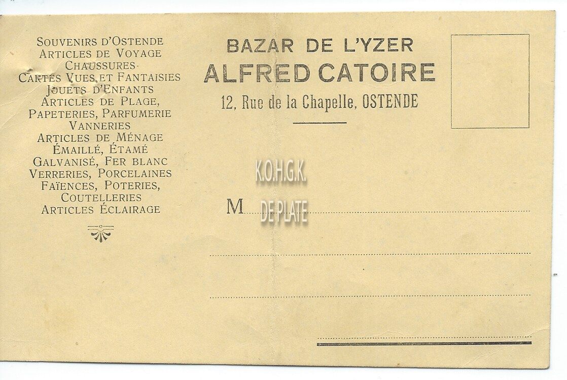 Souvenier d'Ostende. Articles de voyage. Chaussures. Carte vue, et fantaisies. Jouets d'enfants. Articles de plage. Papeteries, parfumerie. Vanneries. Articles de ménage. Emaillé, étamé. Galvanisé, fer blanc. Verreries, porcelaines. Faïences, poteries, coutelleries. Articles éclairage