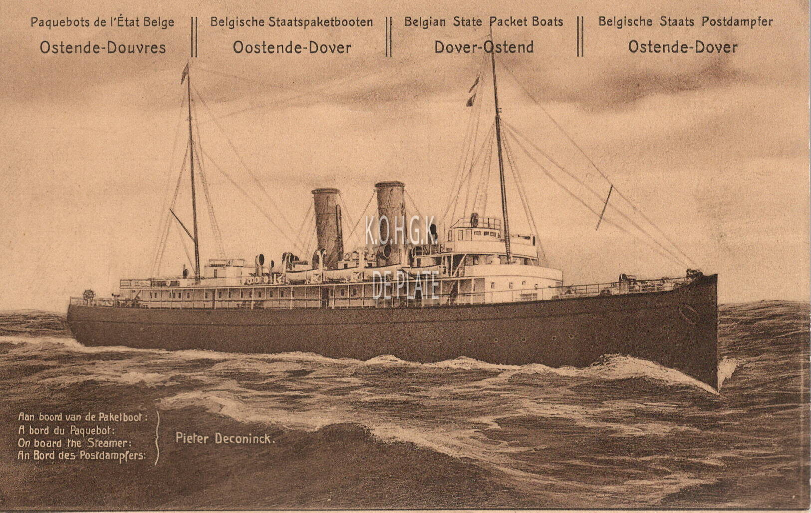 Postwaardestuk 5 cent. - Paquebots de l'Etat Belge Ostende-Douvres. Belgische Staatspaketboten Oostend-Dover. Beglian State Packet BoatsDover-Ostend. Belgische Staats Postdampler Ostende-Dover. - Aan boord van de Paketboot, A bord du Pauebot, On board the steamer, An Bord des Postdamplers Pieter Deconinck