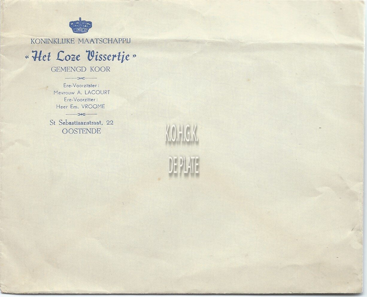 Omschrijving Ere-Voorzitster : Mevrouw A. Lacourt. Ere-Voorzitter : Heer Em. Vroome Trefwoorden BRIEFOMSLAGEN HET LOZE VISSERTJE (KOOR) VERENIGINGEN ; MUZIEK SINT-SEBASTIAANSTRAAT Plaatskenmerk ARCHIEF 110 ARCHIEFDOOS KUNSTEN Inventarisnummers 2009/0464 Herkomst ZANDERS (MEVROUW) Print
