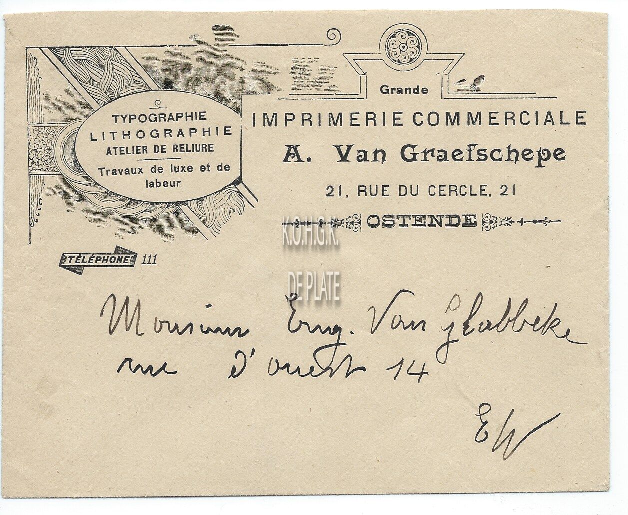 Briefomslag : A. Van Graefschepe. Grande Imprimerie Commerciale. Cirkelstraat 21, Oostende