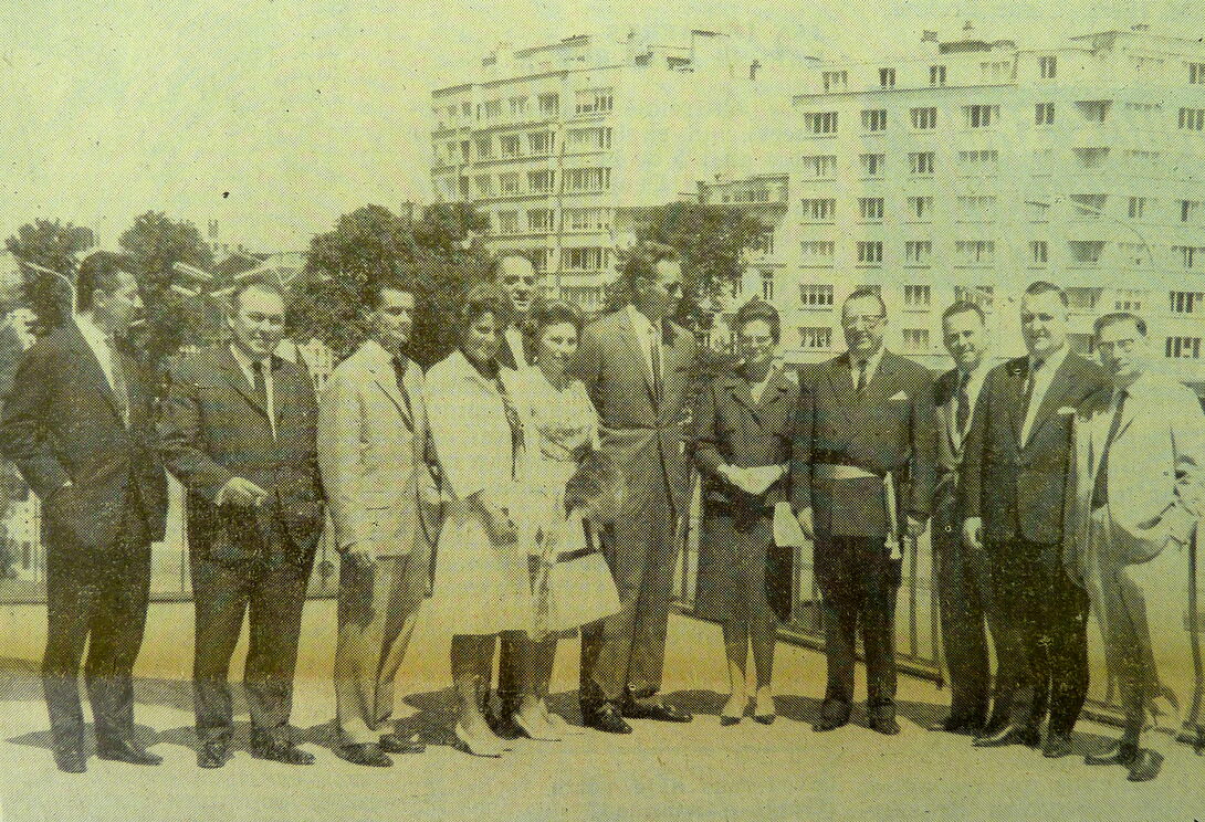 Foto : Charlton Heston en vrienden worden ontvangen op het terras van het stadhuis. We herkennen o.a. schepen John Lauwereins, uiterst rechts de heer Pierre Vanhakendover