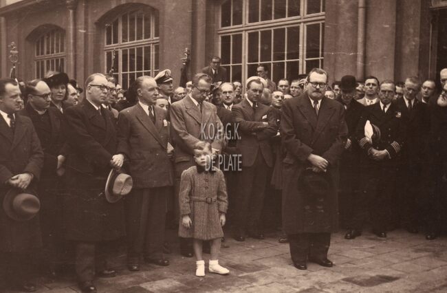 formaat : 13 x 18 cm. - Ontvangst van prins Alexander op de school. Naast de prins zit bisschop Emiel Jozef Desmedt daarnaast burgemeester Adolf Van Glabbeke. Rechts naast de micro burgemeester August Plovie van Bredene…