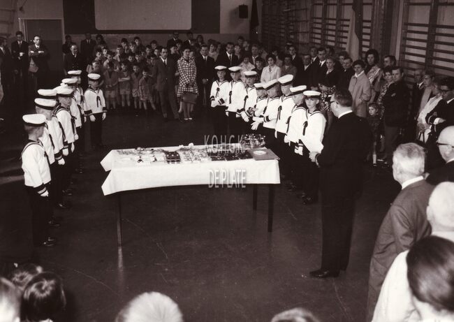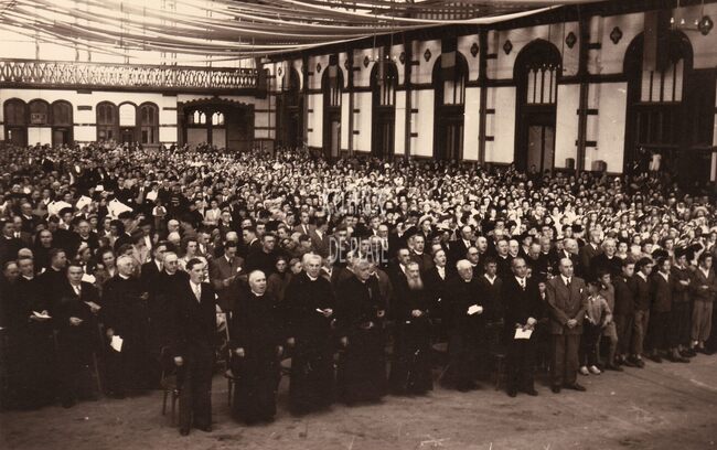 Formaat : 13 x 18 cm. - Vooraan helemaal rechts enkele leerlingen van de Ibisschool op de gouden priesterjubileum van Z.J.H. Joseph Desmet in de Albert Hall van het oud stationsgebouw aan het Ernest Feysplein. Bron…
