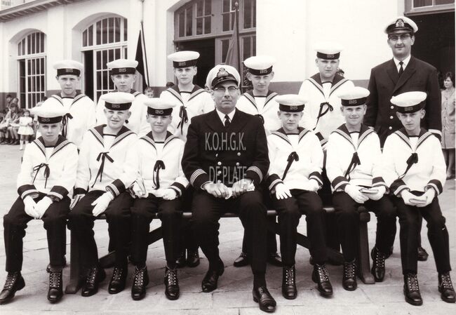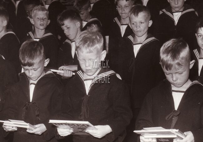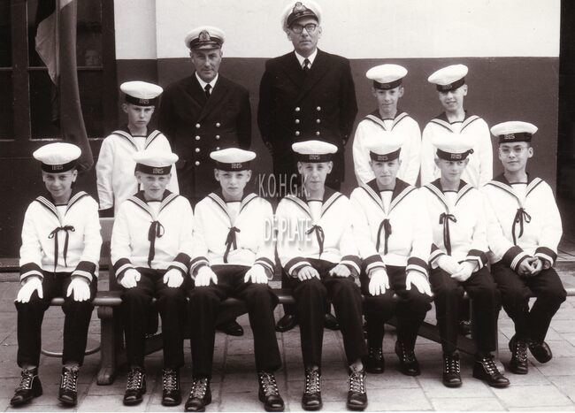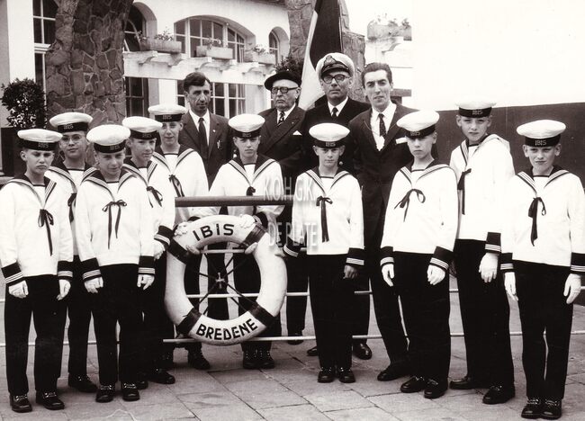 Formaat : 18 x 13 cm. - De leerlingen van het Koninklijk Werk Ibis opgesteld rond het Nationaal Monument voor de Zeelieden op het Zeeheldenplein. Vooraan centraal directeur René David. In het begin sierden enkele ontladen…