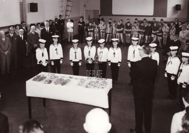 Formaat : 13 x 18 cm. - Inhuldiging van de gedenksteen in de Ibisschool. De gedenksteen is gewijd aan de 34 oudleerlingen op zee gesneuveld tijdens de twee Wereldoorlogen