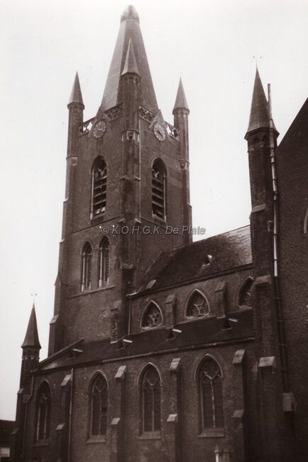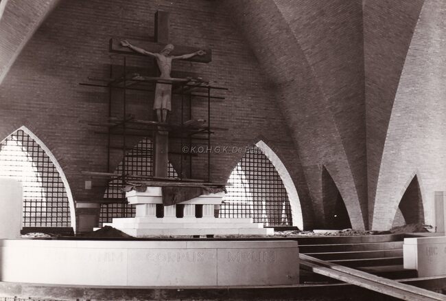 Interieur van de Sint-Niklaaskerk te Oostduinkerke. Het gebouw is nog niet afgewerkt.