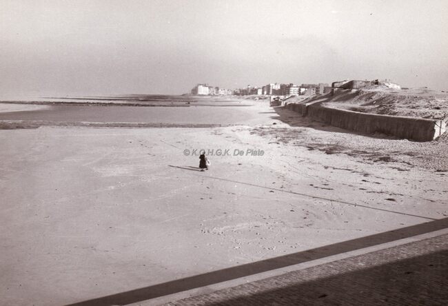 Het strand bij laag water kort na de Tweede Wereldoorlog. Rechts een stuk Atlantikwal met geschutsbunker.(Middelkerke of De Haan ?)