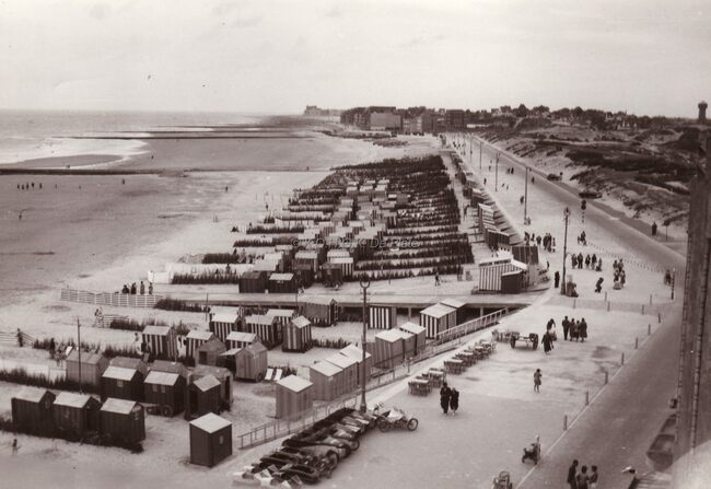 Zeedijk en strand bij eb te Middelkerke (of De Haan ?).sommige badhokjes nog op wielen. op de voorgrond verhuur van "billenkarren".