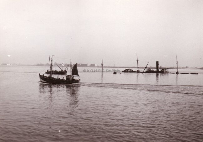 Kort na het einde van de Tweede Wereldoorlog varen vissersboten voor Zeebrugge langs gezonken vrachtschepen.