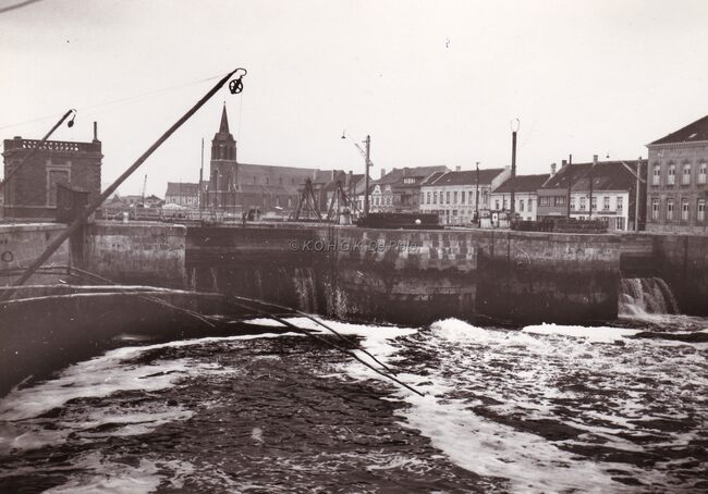 Het sluizencomplex aan het Sas te Bredene. Links de verdwenen kerk van Molendorp.