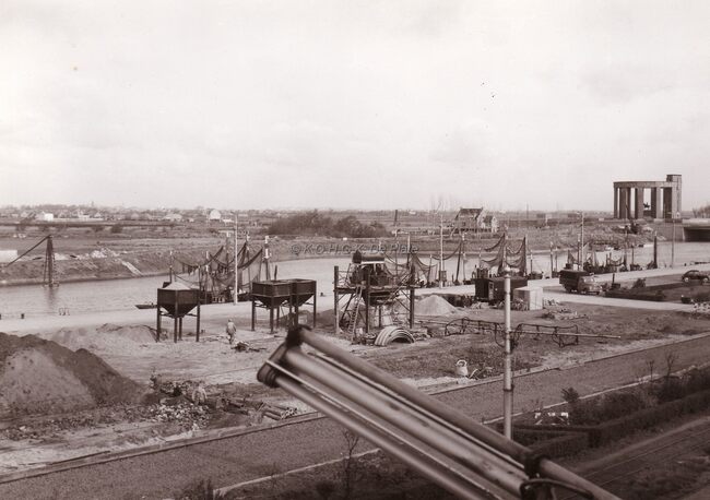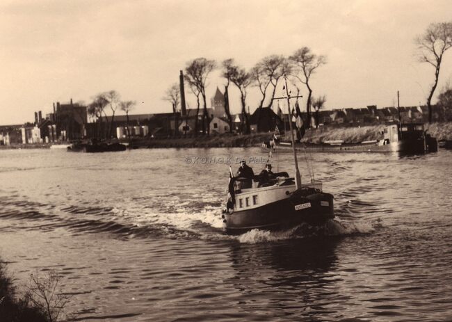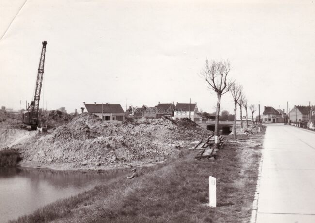 De Brugse Vaart ter hoogte van Bredene Sas. Op de achtergrond rechts de kerk van Bredene dorp. Uiterst links de electriciteitscentrale van 't Sas.