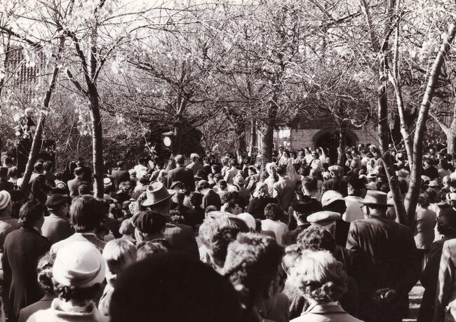 Koning Boudewijn wordt begroet bij zijn vertrek uit De Panne na huldiging aan het Monument van Leopold I.