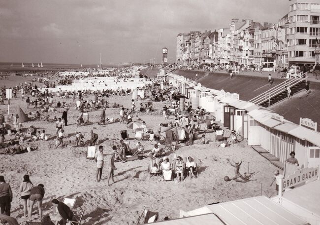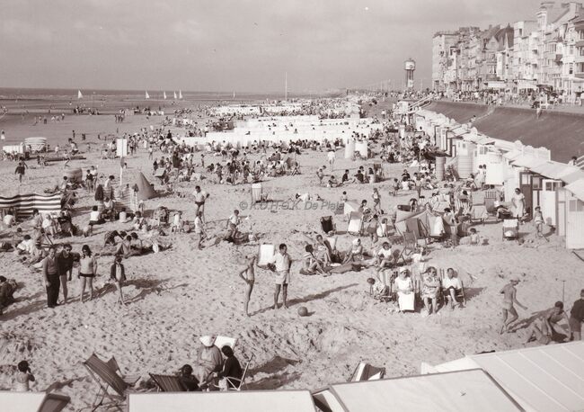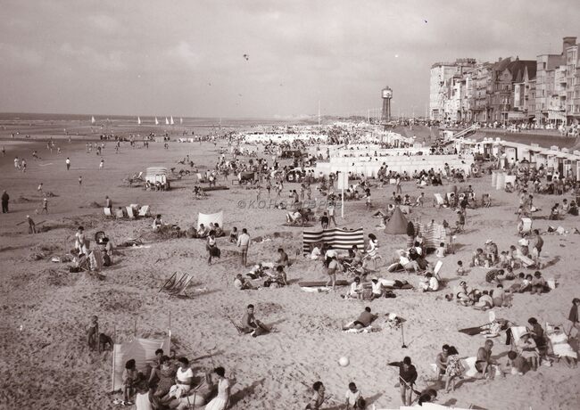 Grote drukte op het strand te Middelkerke bij laagwater.achteraan links zeilwagens.