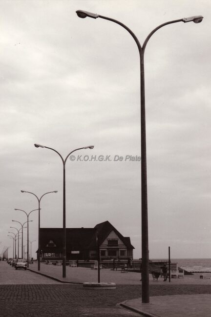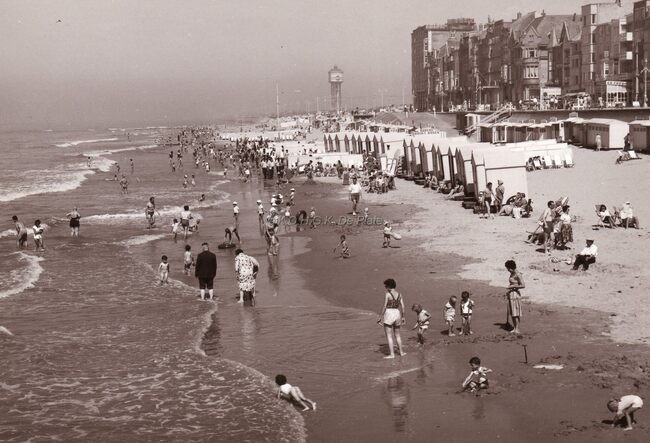 Zeedijk en strand te Middelkerke bij laag water.Links achteraan zeilwagens op het strand,de nog mobiele badhokjes worden naar de waterlijn verplaatst.Rechts in de achtergrond de verdwenen watertoren.