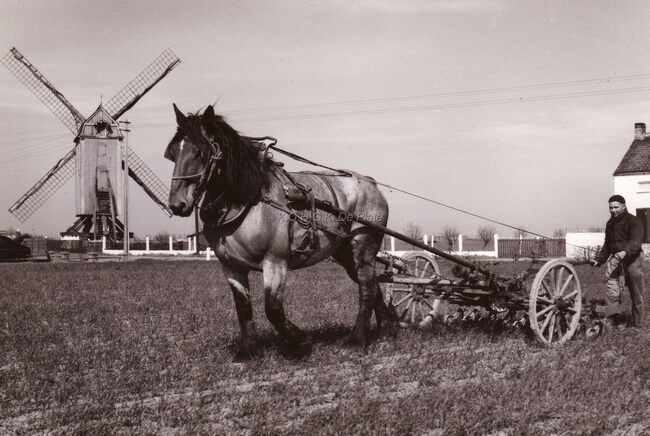 Een boer egt zijn akker voor een houten molen.
